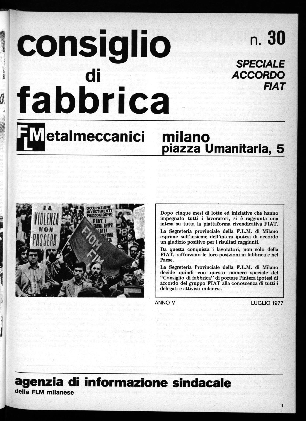 La Segreteria Provinciale della F.L.M. di Milano decide quindi con questo numero speciale del "Consiglio di fabbrica" di portare l'intera ipotesi di accordo del gruppo FIAT alla conoscenza di tutti i delegati e attivisti milanesi.