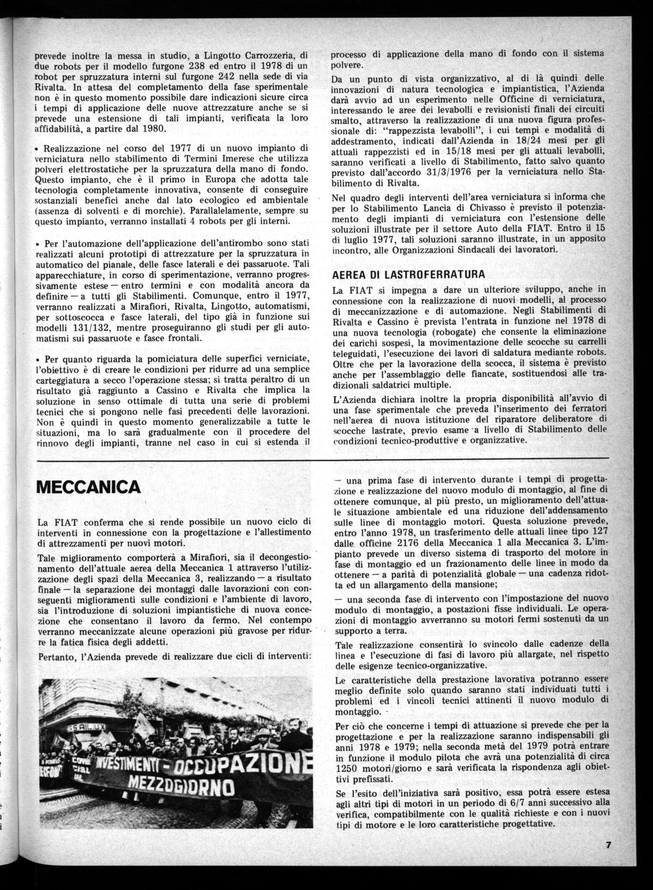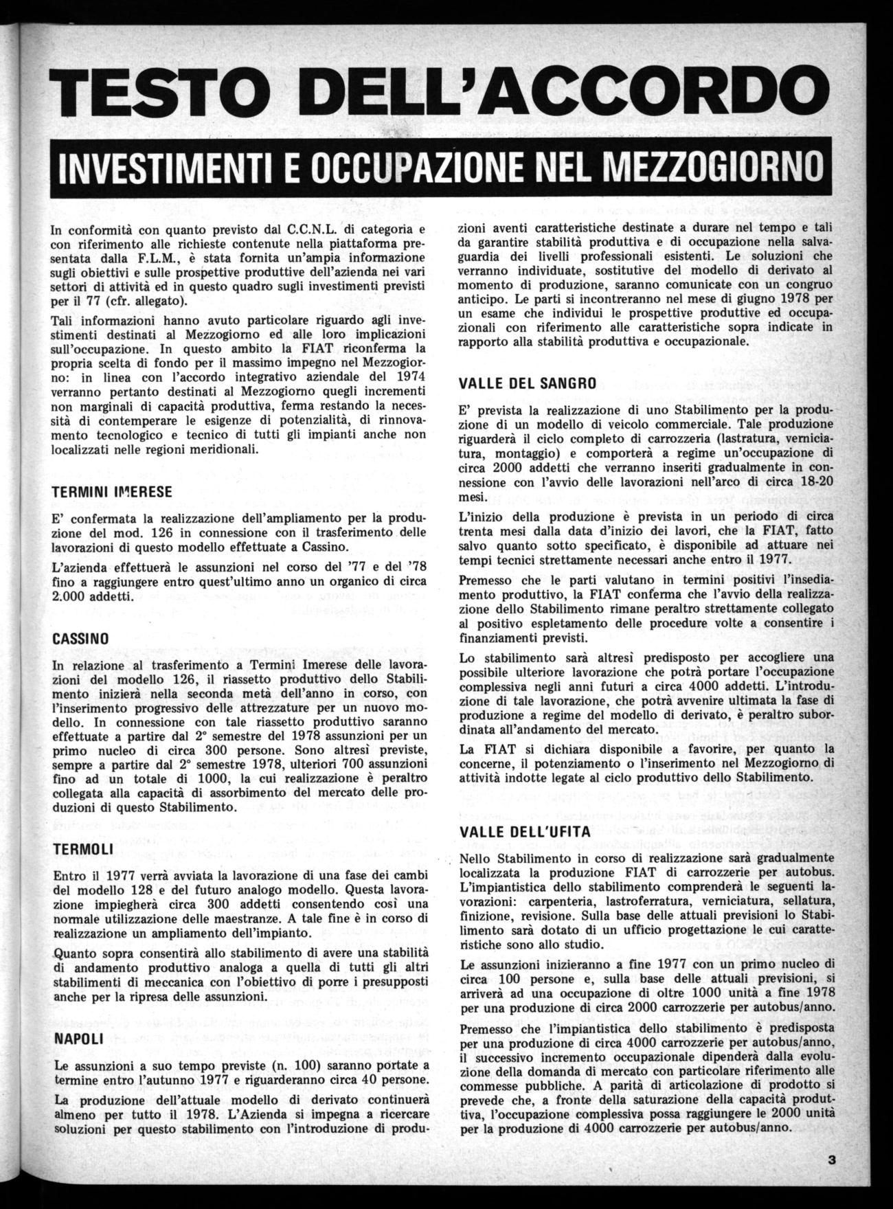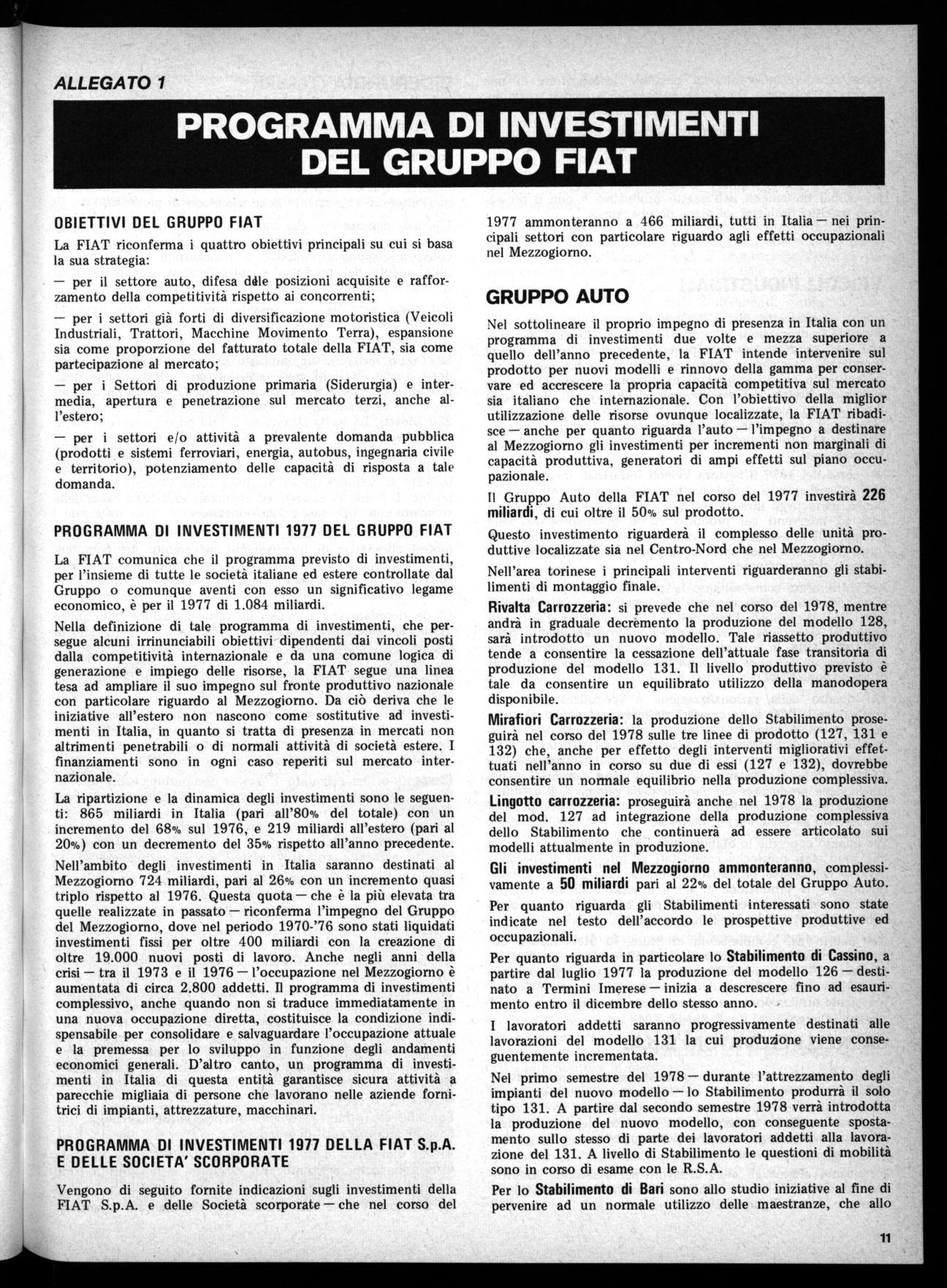 Tali informazioni hanno avuto particolare riguardo agli investimenti destinati al Mezzogiorno ed alle loro implicazioni sull'occupazione. In questo ambito la FIAT riconferma la propria scelta di fondo per il massimo impegno nel Mezzogiorno: in linea con l'accordo integrativo aziendale del 1974 verranno pertanto destinati al Mezzogiorno quegli incrementi non marginali di capacità produttiva, ferma restando la necessità di contemperare le esigenze di potenzialità, di rinnovamento tecnologico e tecnico di tutti gli impianti anche non localizzati nelle regioni meridionali.