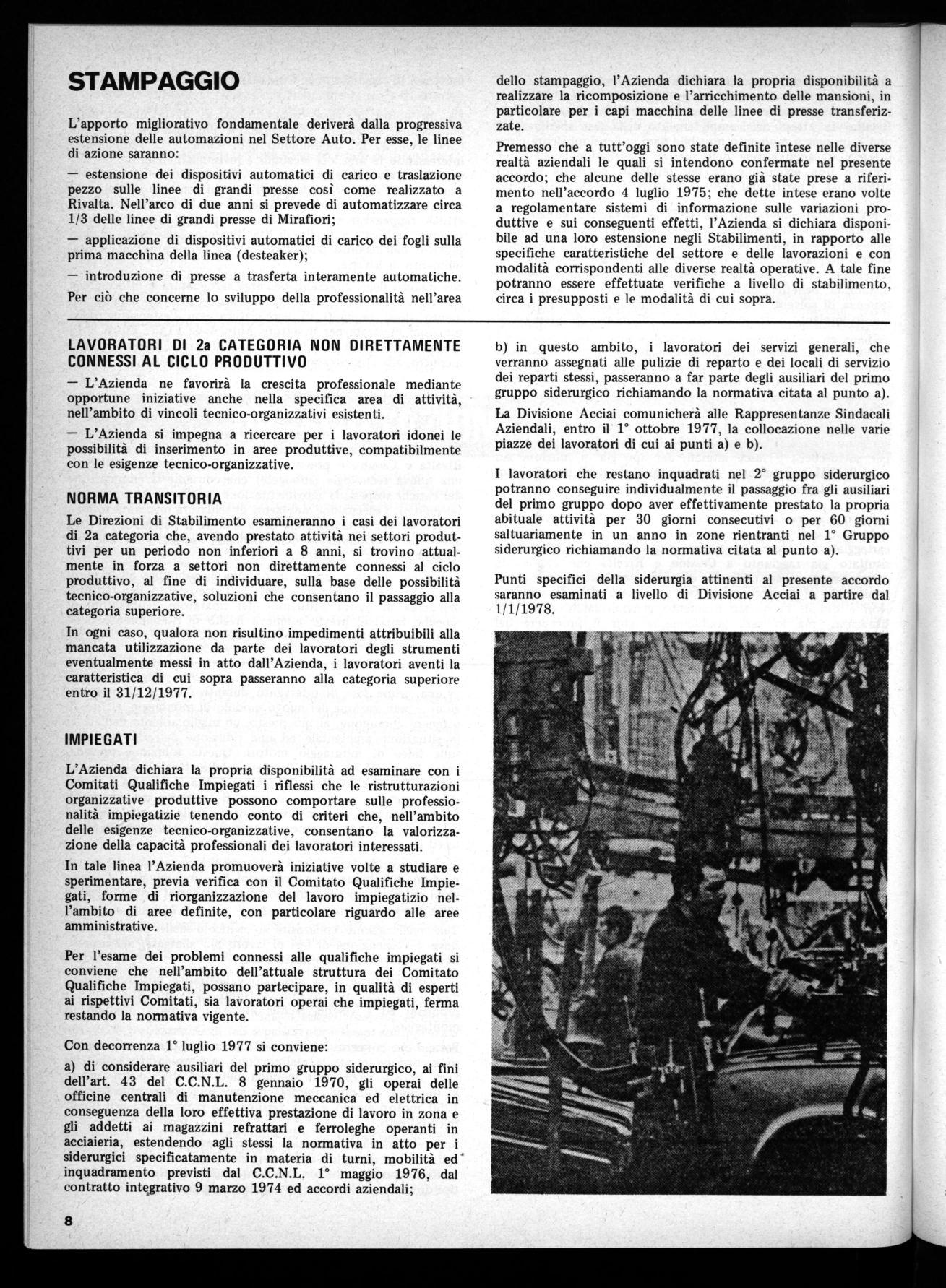Si afferma anche in questa fase la continuità di una linea di trasformazione della organizzazione del lavoro, acquisendo innovative in materia, con importanti riflessi sulla qualificazione professionale; analogamente vanno valutate le conquiste realizzate in materia di difesa della salute in fabbrica con l'applicazione dell'articolo 12 dello statuto e l'introduzione in fabbrica dei patronati.
