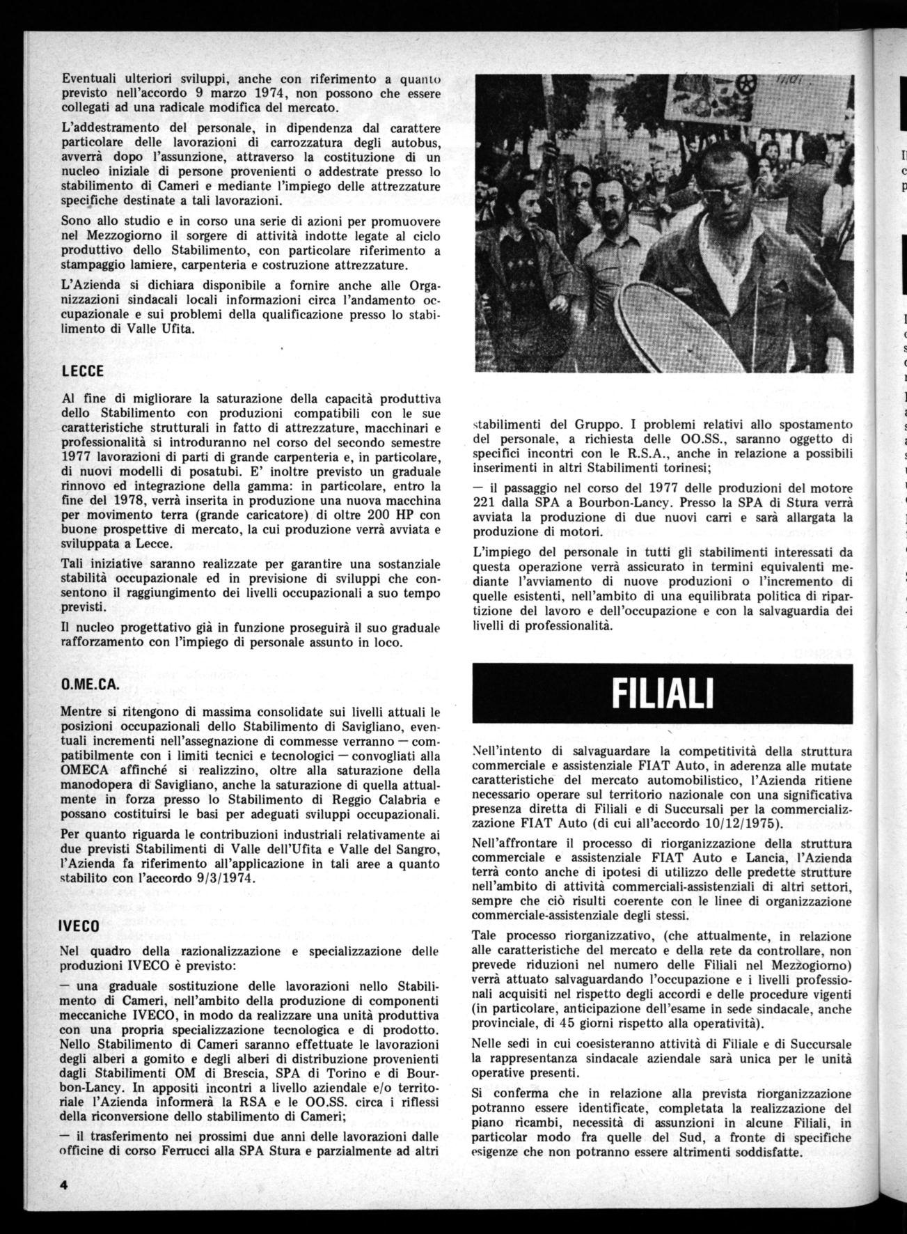 Mentre si ritengono di massima consolidate sui livelli attuali le posizioni occupazionali dello Stabilimento di Savigliano, eventuali incrementi nell'assegnazione di commesse verranno — compatibilmente con i limiti tecnici e tecnologici — convogliati alla OMECA affinché si realizzino, oltre alla saturazione della manodopera di Savigliano, anche la saturazione di quella attualmente in forza presso lo Stabilimento di Reggio Calabria e possano costituirsi le basi per adeguati sviluppi occupazionali. Per quanto riguarda le contribuzioni industriali relativamente ai due previsti Stabilimenti di Valle dell'Ufita e Valle del Sangro, l'Azienda fa riferimento all'applicazione in tali aree a quanto stabilito con l'accordo 9/3/1974.