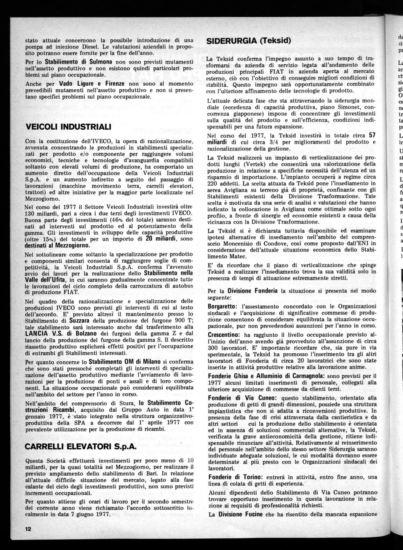 Fonderie Ghisa e Alluminio di Carmagnola:sono previsti per il 1977 alcuni limitati inserimenti di personale, collegati alla ulteriore acquisizione di commesse da clienti terzi.