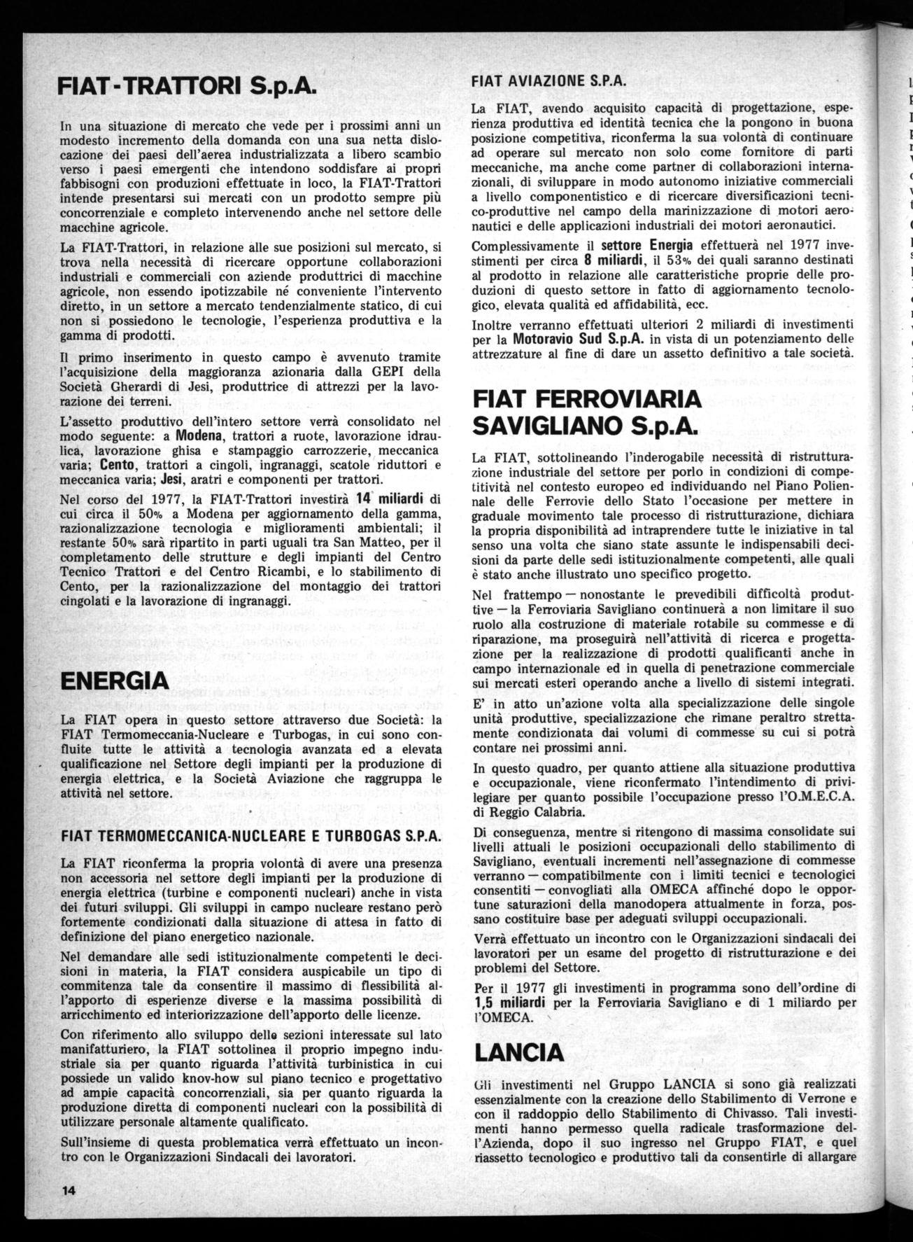La FIAT, avendo acquisito capacità di progettazione, esperienza produttiva ed identità tecnica che la pongono in buona posizione competitiva, riconferma la sua volontà di continuare ad operare sul mercato non solo come fornitore di parti meccaniche, ma anche come partner di collaborazioni internazionali, di sviluppare in modo autonomo iniziative commerciali a livello componentistico e di ricercare diversificazioni tecnico-produttive nel campo della marinizzazione di motori aeronautici e delle applicazioni industriali dei motori aeronautici. Complessivamente il settore Energia effettuerà nel 1977 investimenti per circa 8 miliardi, il 53% dei quali saranno destinati al prodotto in relazione alle caratteristiche proprie delle produzioni di questo settore in fatto di aggiornamento tecnologico, elevata qualità ed affidabilità, ecc.