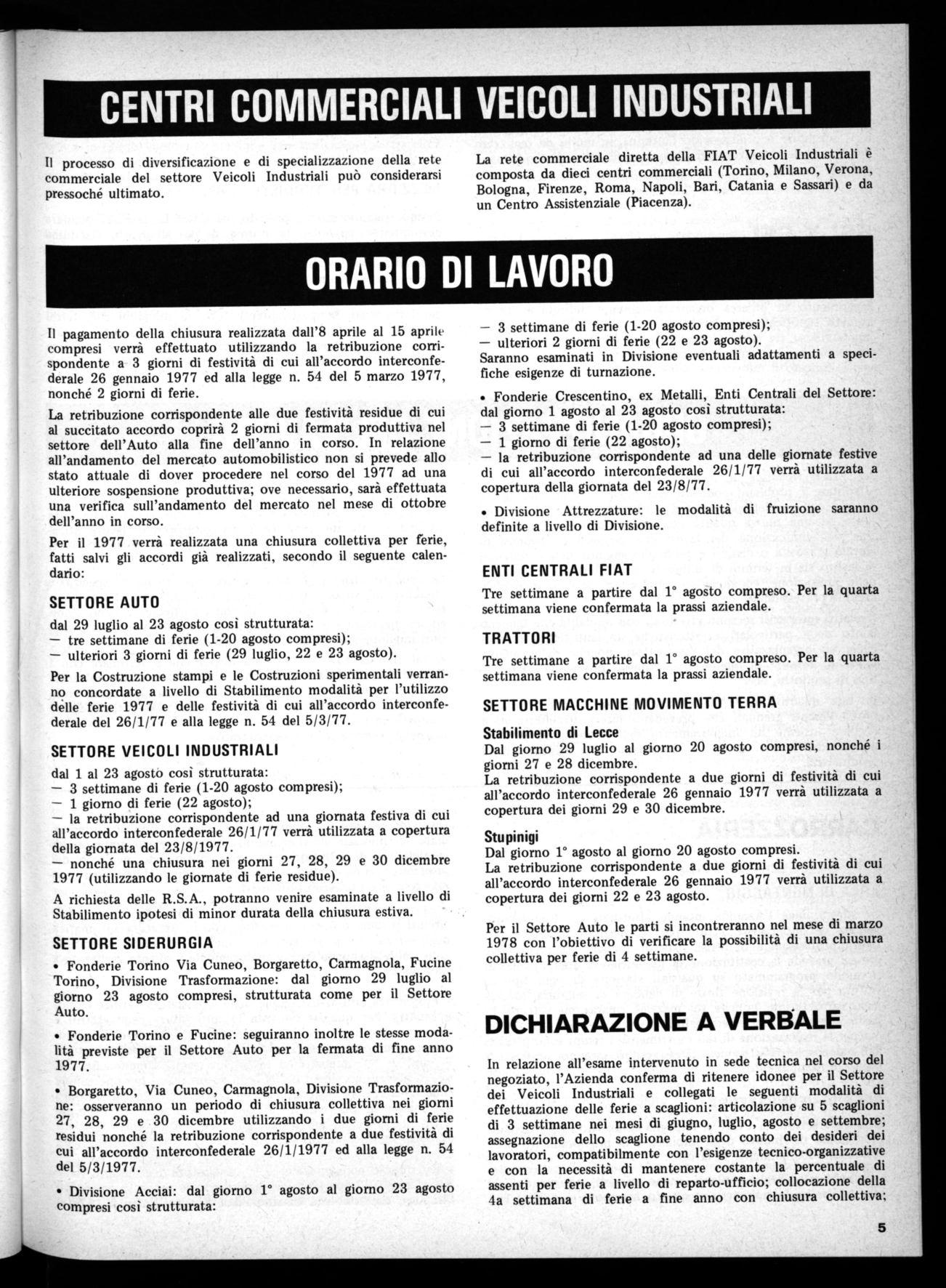 Per la Costruzione stampi e le Costruzioni sperimentali verranno concordate a livello di Stabilimento modalità per l'utilizzo delle ferie 1977 e delle festività di cui all'accordo interconfederale del 26/1/77 e alla legge n. 54 del 5/3/77.
