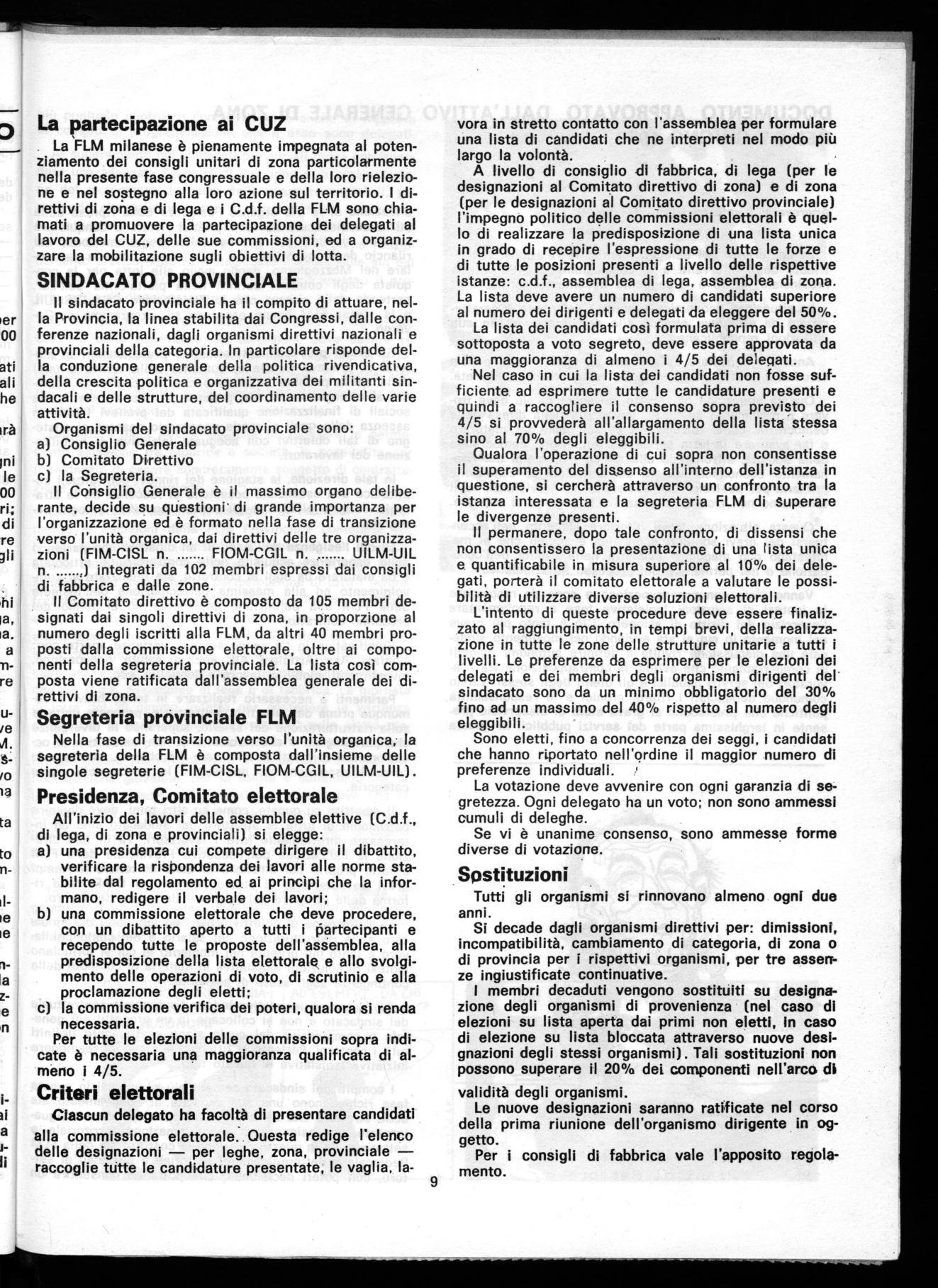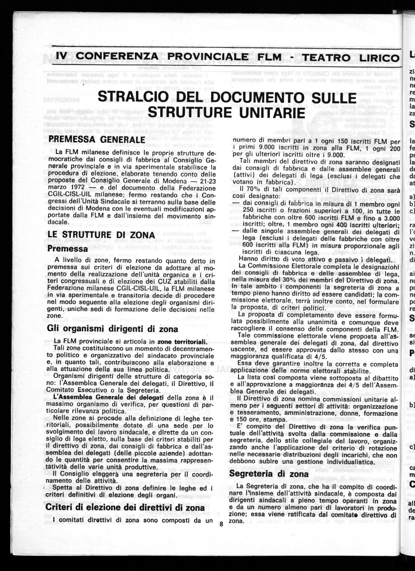 A livello di zone, fermo restando quanto detto in premessa sui criteri di elezione da adottare al momento della realizzazione dell'unità organica e i criteri congressuali e di elezione dei CUZ stabiliti dalla Federazione milanese CGiL-CISL-UIL, la FLM milanese in via sperimentale e transitoria decide di procedere nel modo seguente alla elezione degli organismi dirigenti, uniche sedi di formazione delle decisioni nelle zone.