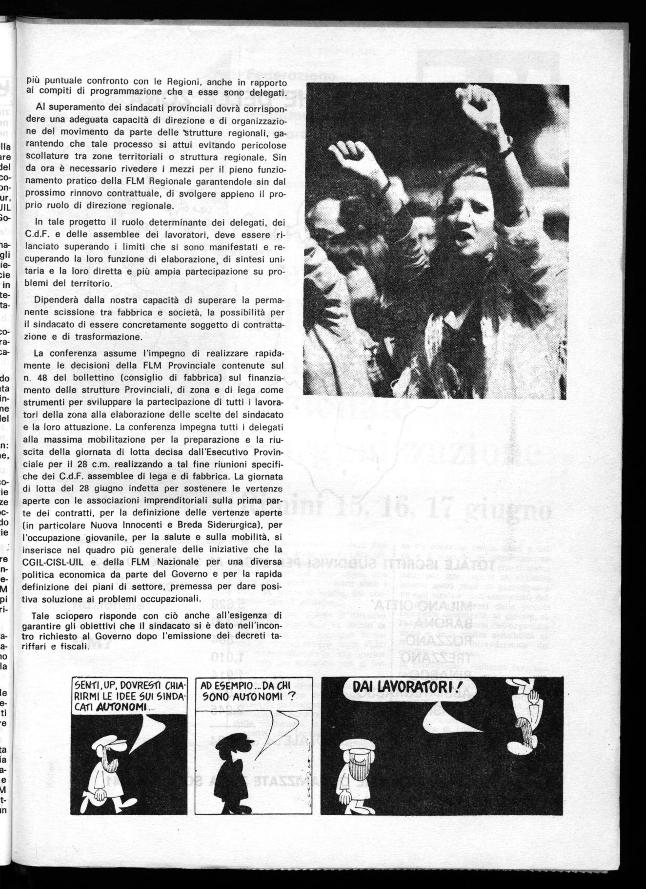 La conferenza assume l'impegno di realizzare rapidamente le decisioni della FLM Provinciale contenute sul n 48 del bollettino (consiglio di fabbrica) sul finanziamento delle strutture Provinciali, di zona e di lega come strumenti per sviluppare la partecipazione di tutti i lavoratori della zona alla elaborazione delle scelte del sindacato e la loro attuazione. La conferenza impegna tutti i delegati alla massima mobilitazione per la preparazione e la riuscita della giornata di lotta decisa dall'Esecutivo Provinciale per il 28 c.m. realizzando a tal fine riunioni specifiche dei C.d.F. assemblee di lega e di fabbrica. La giornata di lotta del 28 giugno indetta per sostenere le vertenze aperte con le associazioni imprenditoriali sulla prima parte dei contratti, per la definizione delle vertenze aperte (in particolare Nuova Innocenti e Breda Siderurgica), per l'occupazione giovanile, per la salute e sulla mobilità, si inserisce nel quadro più generale delle iniziative che la CGIL-CISL-UIL e della FLM Nazionale per una diversa politica economica da parte del Governo e per la rapida definizione dei piani di settore, premessa per dare positiva soluzione ai problemi occupazionali.