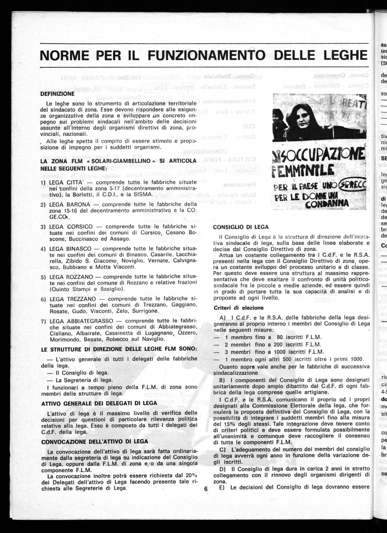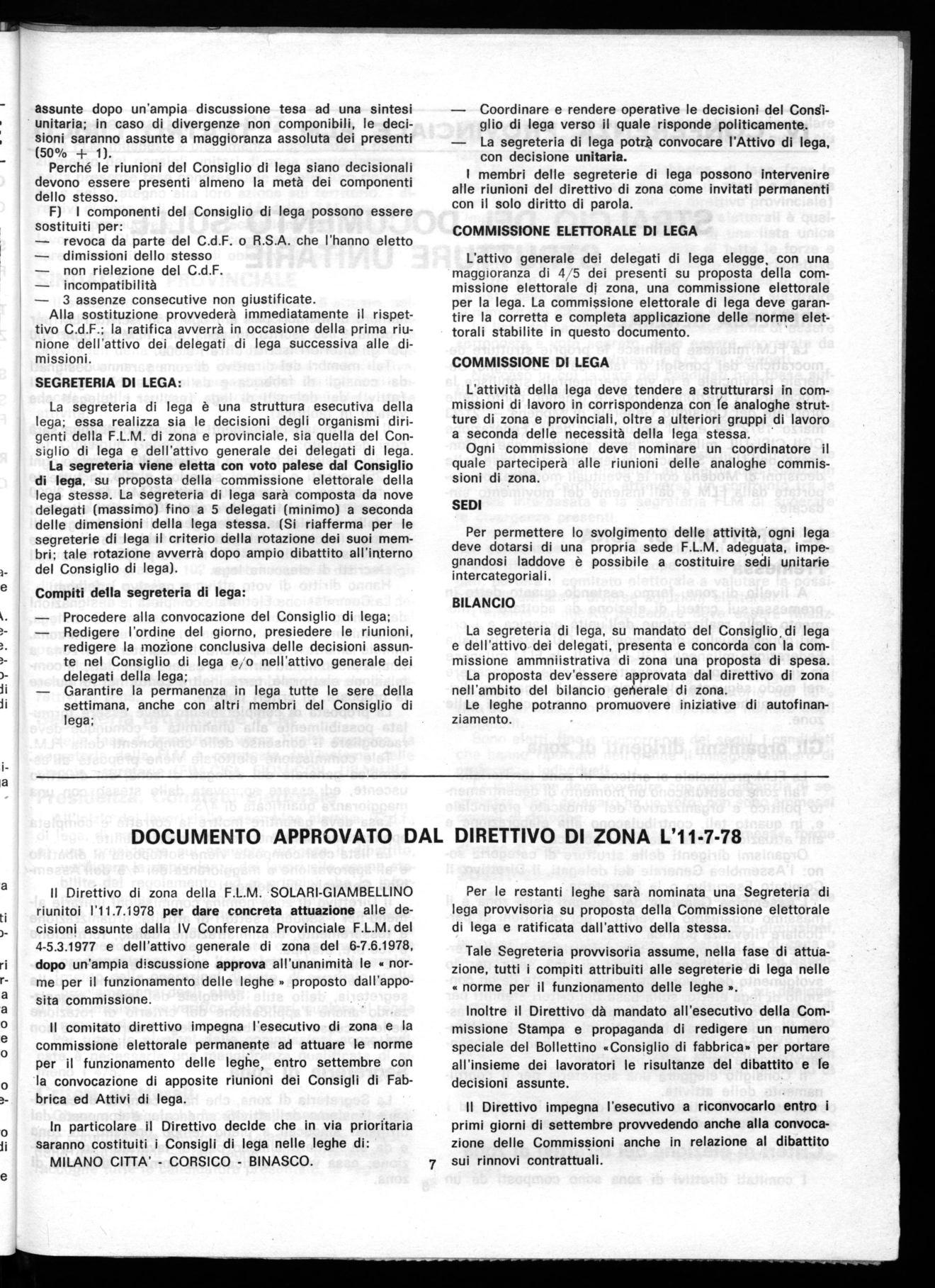 II Direttivo di zona della F.L.M. SOLARI-GIAMBELLINO riunitoi 1'11.7.1978 per dare concreta attuazione alle decisioni assunte dalla IV Conferenza Provinciale F.L.M. del 4-5.3.1977 e dell'attivo generale di zona del 6-7.6.1978, dopo un'ampia discussione approva all'unanimità le « norme per il funzionamento delle leghe » proposto dall'apposita commissione.