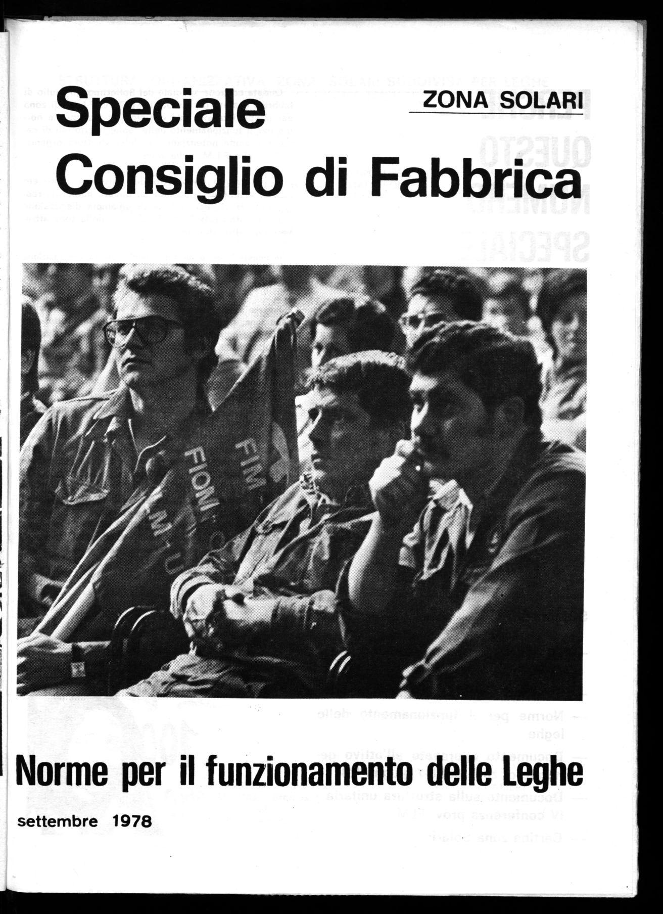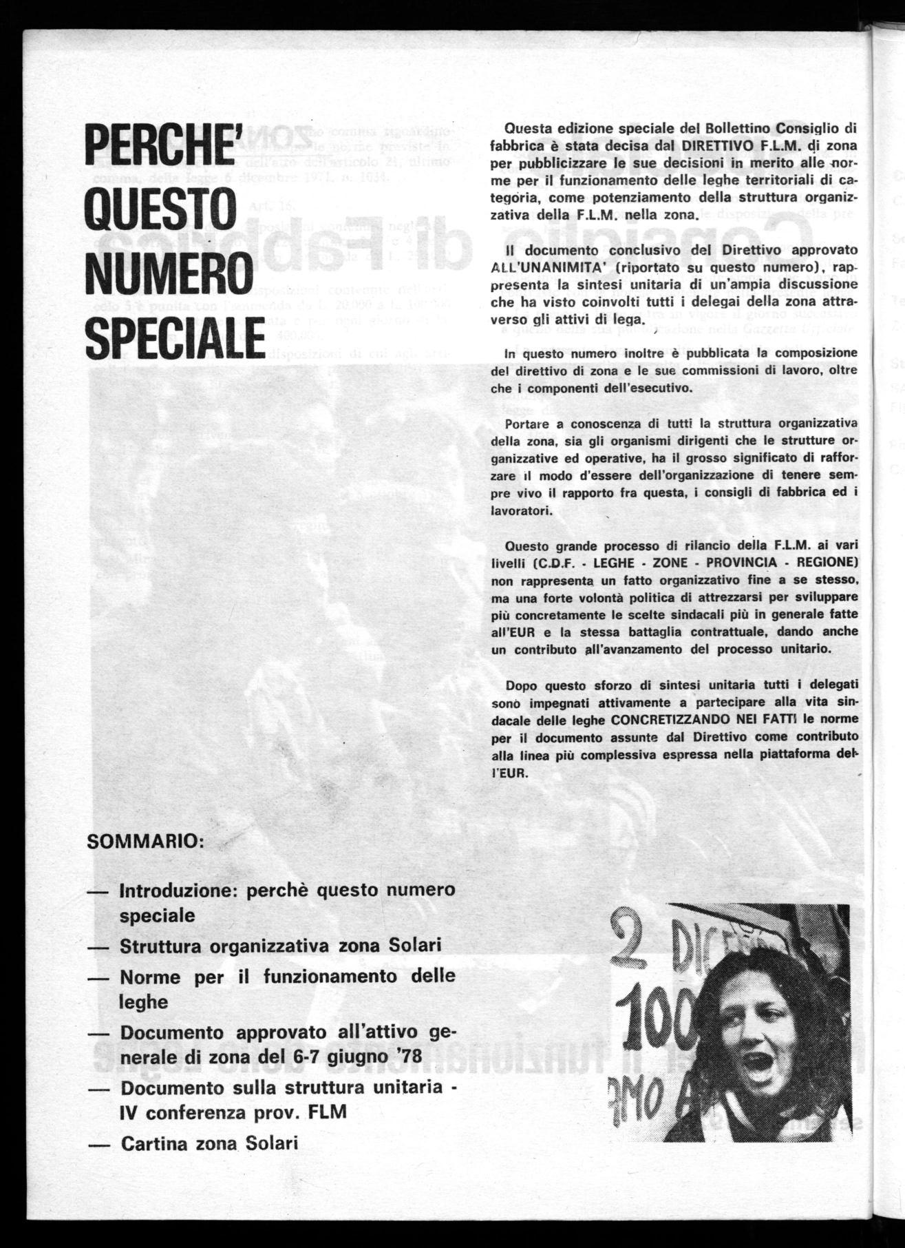 Questa edizione speciale del Bollettino Consiglio di fabbrica è stata decisa dal DIRETTIVO F.L.M. di zona per pubblicizzare le sue decisioni in merito alle norme per il funzionamento delle leghe territoriali di categoria, come potenziamento della struttura organizzativa della F.L.M. nella zona.