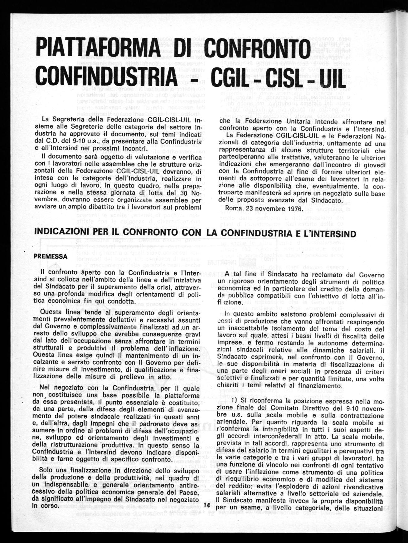 Il confronto aperto con la Confindustria e l'Intersind si colloca nell'ambito della linea e dell'iniziativa del Sindacato per il superamento della crisi, attraverso una profonda modifica degli orientamenti di politica econdmica fin qui condotta.