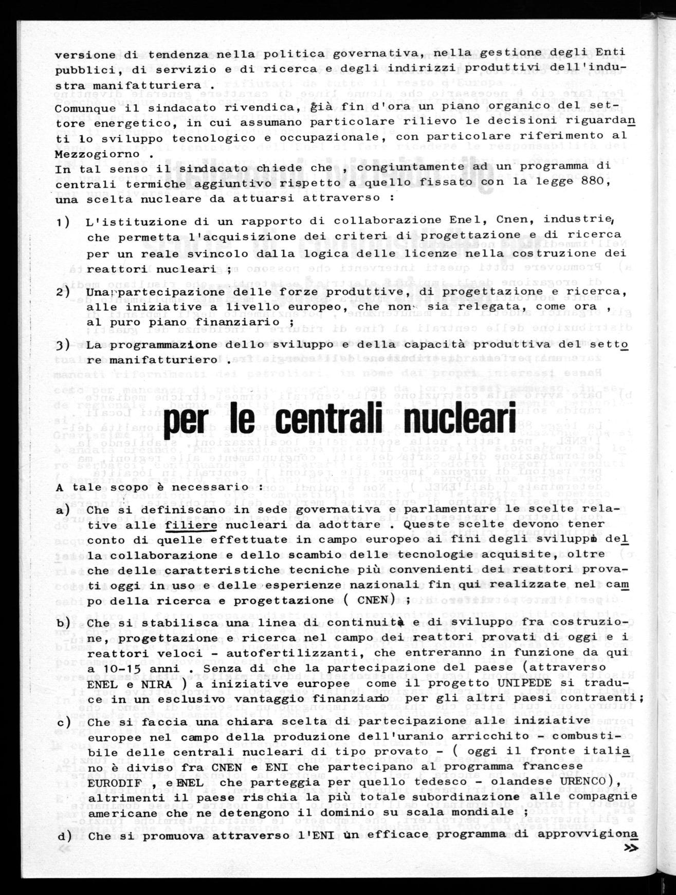 In tal senso il sindacato chiede che , congiuntamente ad un programma di centrali termiche aggiuntivo rispetto a quello fissato con la legge 880, una scelta nucleare da attuarsi attraverso :
