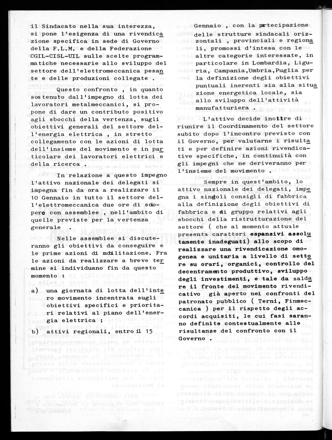 In relazione a questo impegno l'attivo nazionale dei delegati si impegna fin da ora a realizzare il 10 Gennaio in tutto il settore dell'elettromeccanica due ore di sciopero con assemblee , nell'ambito di quelle previste per la vertenza generale