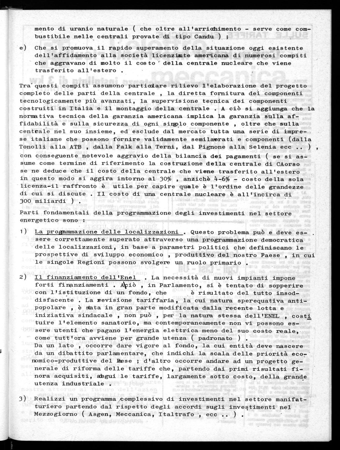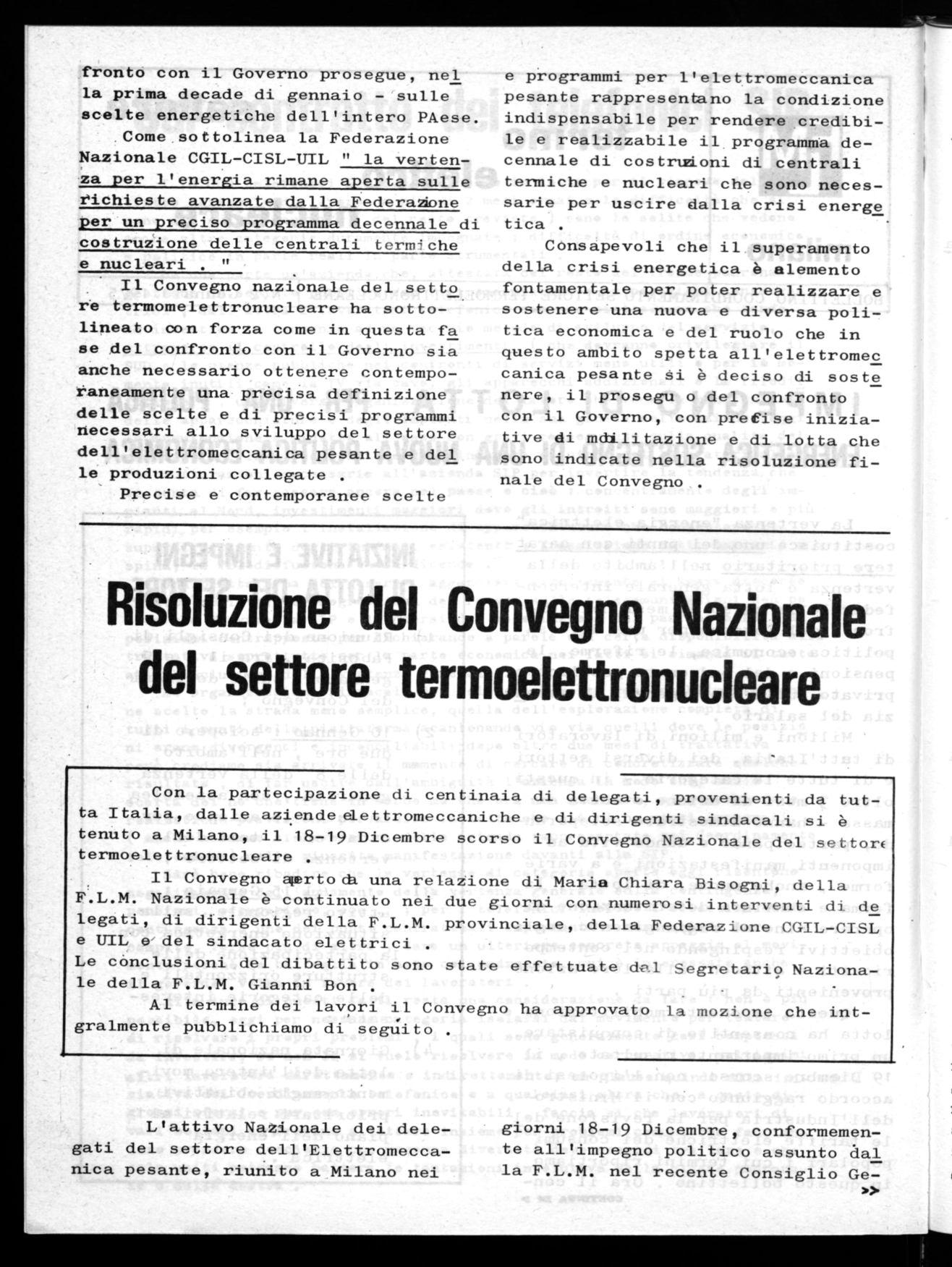 Consapevoli che il superamento della crisi energetica è elemento fontamentale per poter realizzare e sostenere una nuova e diversa politica economica e del ruolo che in questo ambito spetta all'elettromec canica pesante si è deciso di soste nere, il prosegu o del confronto con il Governo, con preCise iniziative di mdilitazione e di lotta che sono indicate nella risoluzione finale del Convegno .
