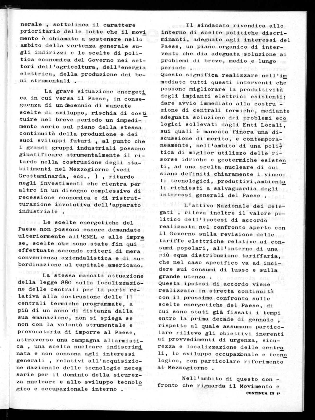 Comunque il sindacato rivendica, già fin d'ora un piano organico del settore energetico, in cui assumano particolare rilievo le decisioni riguardan ti lo sviluppo tecnologico e occupazionale, con particolare riferimento al Mezzogiorno .