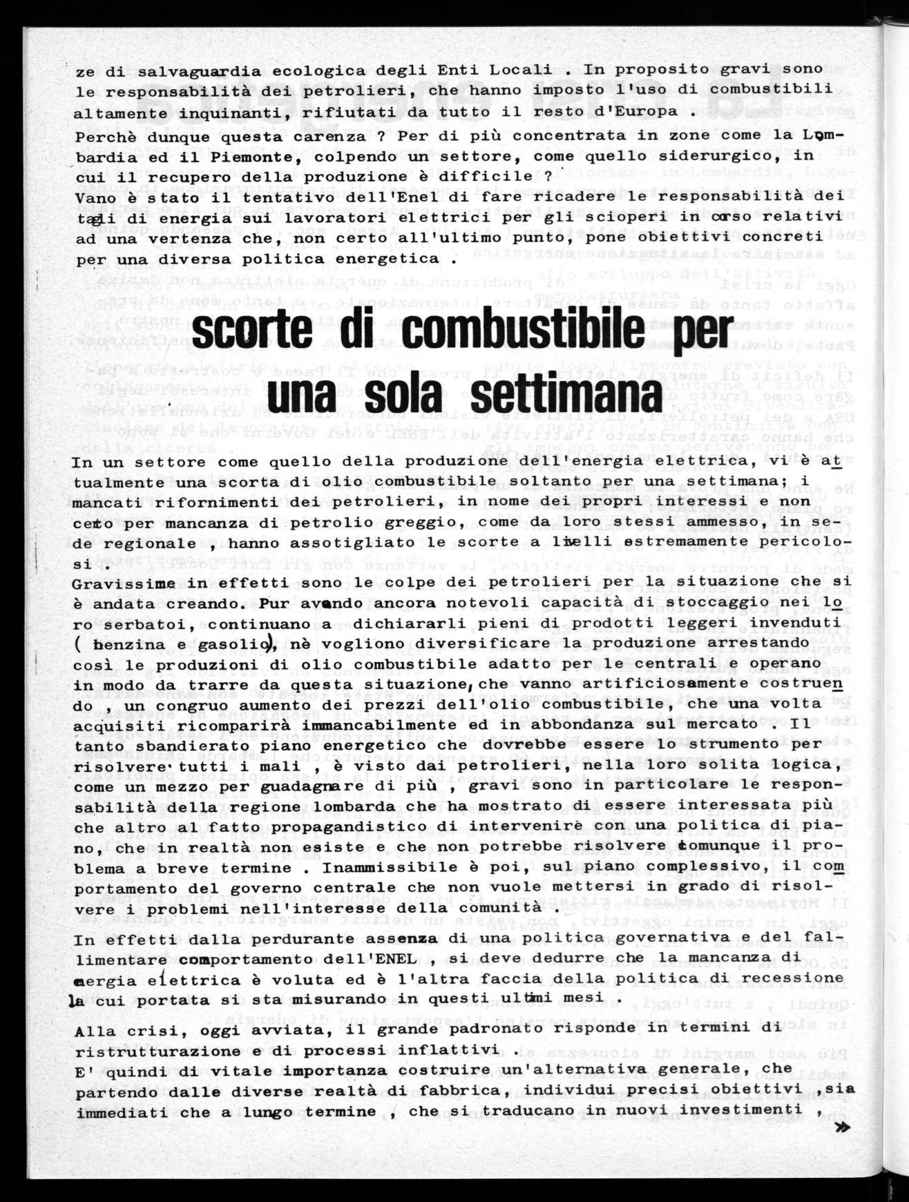 Gravissime in effetti sono le colpe dei petrolieri per la situazione che si è andata creando. Pur avendo ancora notevoli capacità di stoccaggio nei lo ro serbatoi, continuano a dichiararli pieni di prodotti leggeri invenduti ( benzina e gasolio0, nè vogliono diversificare la produzione arrestando così le produzioni di olio combustibile adatto per le centrali e operano in modo da trarre da questa situazione che vanno artificiosamente costruen do , un congruo aumento dei prezzi dell'olio combustibile, che una volta acquisiti ricomparirà immancabilmente ed in abbondanza sul mercato . Il tanto sbandierato piano energetico che dovrebbe essere lo strumento per risolvere. tutti i mali , è visto dai petrolieri, nella loro solita logica, come un mezzo per guadagnare di più , gravi sono in particolare le responsabilità della regione lombarda che ha mostrato di essere interessata più che altro al fatto propagandistico di intervenire con una politica di piano, che in realtà non esiste e che non potrebbe risolvere Comunque il problema a breve termine . Inammissibile è poi, sul piano complessivo, il com portamento del governo centrale che non vuole mettersi in grado di risolvere i problemi nell'interesse della comunità .