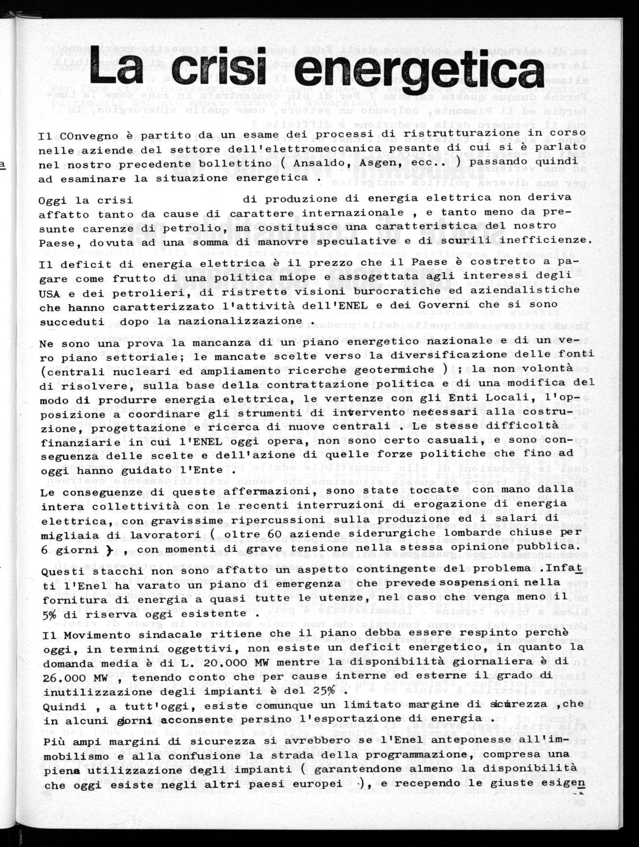Le conseguenze di queste affermazioni, sono state toccate con mano dalla intera collettività con le recenti interruzioni di erogazione di energia elettrica, con gravissime ripercussioni sulla produzione ed i salari di migliaia di lavoratori ( oltre 60 aziende siderurgiche lombarde chiuse per 6 giorni > con momenti di grave tensione nella stessa opinione pubblica. Questi stacchi non sono affatto un aspetto contingente del problema .Infat ti l'Enel ha varato un piano di emergenza che prevede sospensioni nella fornitura di energia a quasi tutte le utenze, nel caso che venga meno il 5% di riserva oggi esistente