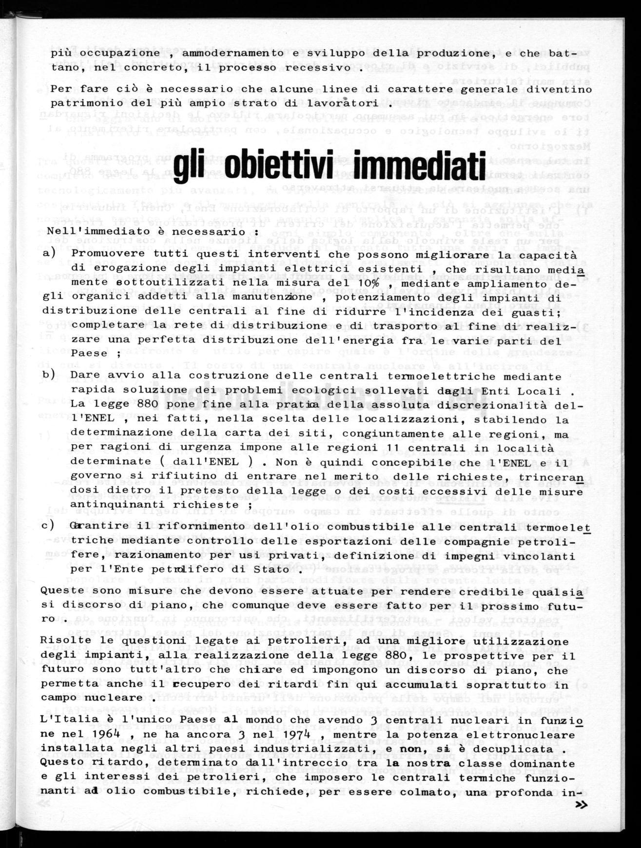 La grave situazione energeti ca in cui versa il Paese, in conseguenza di uncecennio di mancate scelte di sviluppo, rischia di costi_ tuire nel breve periodo un impedimento serio sul piano della stessa continuità della produzione e dei suoi sviluppi futuri , al punto che i grandi gruppi industriali possono giustificare strumentalmente il ritardo nella costruzione degli stabilimenti nel Mezzogiorno (vedi Grottaminarda, ecc.. ) ritardo negli investimenti che rientra per altro in un disegno complessivo di recessione economica e di ristrutturazione involutiva dell'apparato industriale