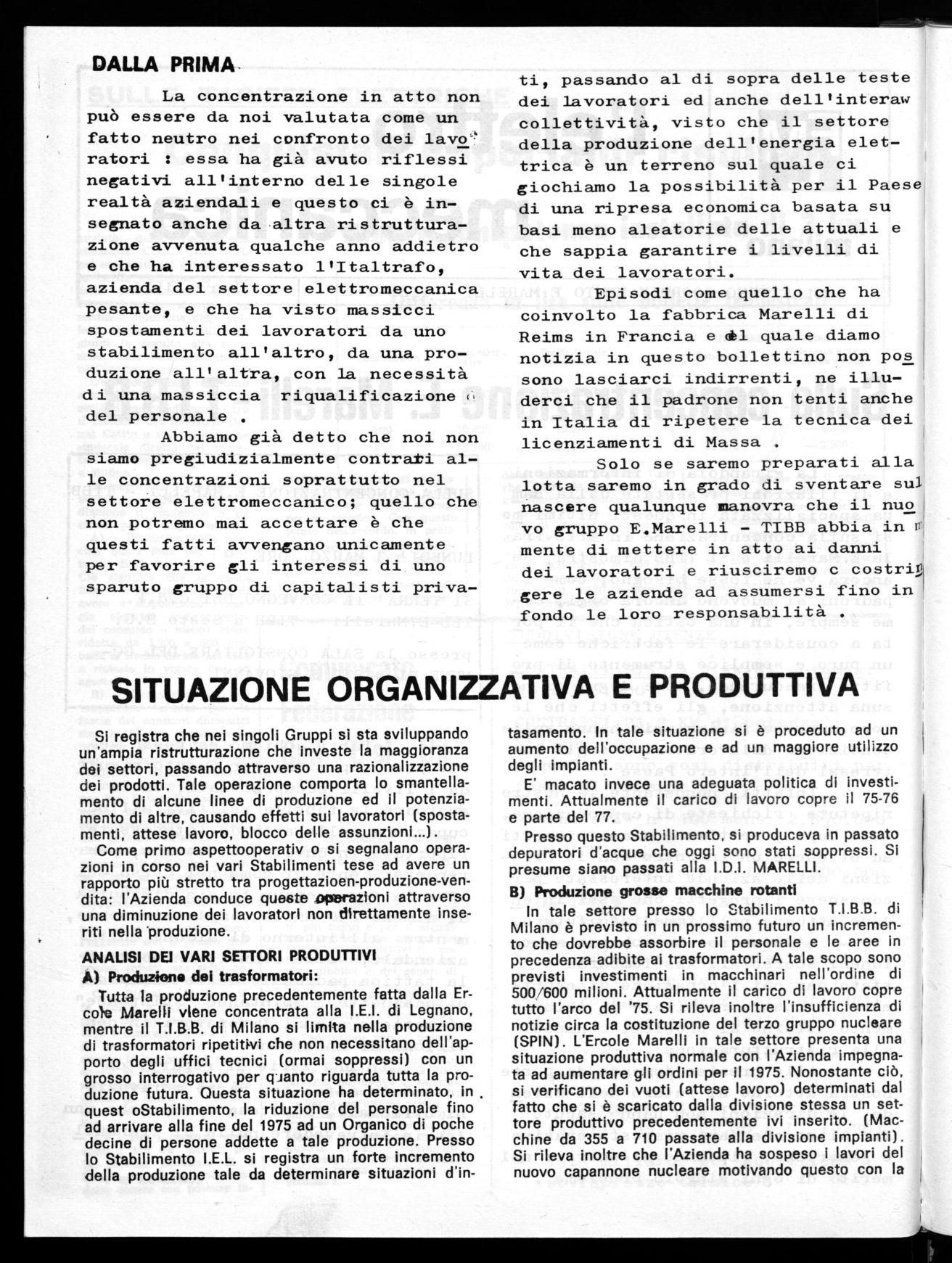 La concentrazione in atto non può essere da noi valutata come un fatto neutro nei confronto dei lavo' ratori : essa ha già avuto riflessi negativi all'interno delle singole realtà aziendali e questo ci è insegnato anche da altra ristrutturazione avvenuta qualche anno addietro e che ha interessato l'Italtrafo, azienda del settore elettromeccanica pesante, e che ha visto massicci spostamenti dei lavoratori da uno stabilimento all'altro, da una produzione all'altra, con la necessità di una massiccia riqualificazione del personale
