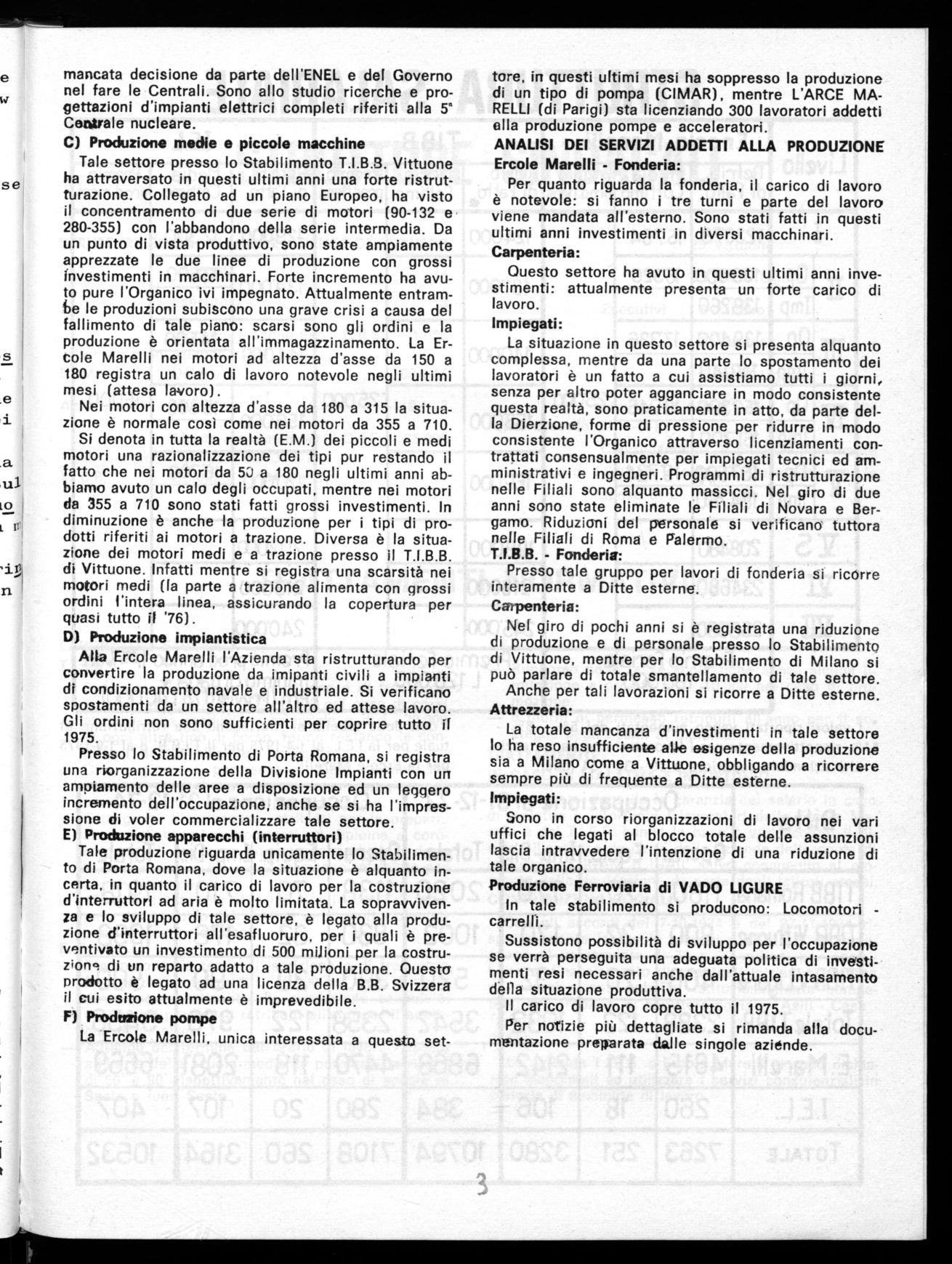 Si denota in tutta la realtà (E.M.) dei piccoli e medi motori una razionalizzazione dei tipi pur restando il fatto che nei motori da 5i a 180 negli ultimi anni abbiamo avuto un calo degli occupati, mentre nei motori da 355 a 710 sono stati fatti grossi investimenti. In diminuzione è anche la produzione per i tipi di prodotti riferiti ai motori a trazione. Diversa è la situazione dei motori medi e a trazione presso il T.I.B.B. di Vittuone. Infatti mentre si registra una scarsità nei motori medi (la parte a trazione alimenta con grossi ordini l'intera linea, assicurando la copertura per quasi tutto i! '76).