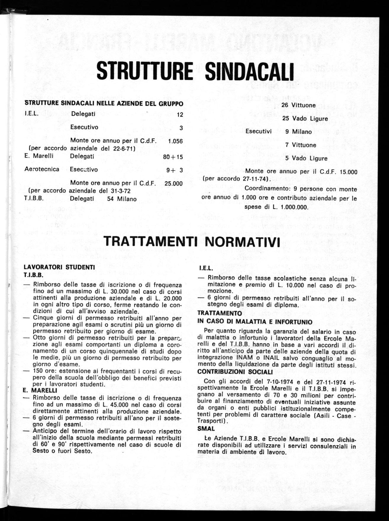 Per quanto riguarda la garanzia del salario in caso di malattia o infortunio i lavoratori della Ercole Marelli e del T.I.B.B. hanno in base a vari accordi il diritto all'anticipo da parte delle aziende della quota di integrazione INAM o INAIL salvo conguaglio al momento della liquidazione da parte degli istituti stessi.