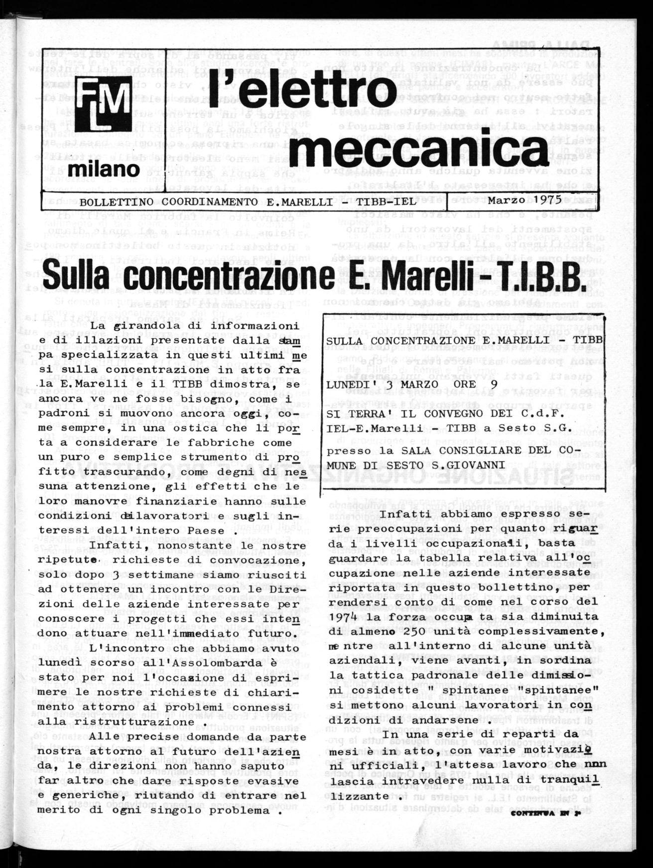 La girandola di informazioni e di illazioni presentate dalla Aam pa specializzata in questi ultimi me si sulla concentrazione in atto fra la E.Marelli e il TIBB dimostra, se ancora ve ne fosse bisogno, come i padroni si muovono ancora oggi, come sempre, in una ostica che li por ta a considerare le fabbriche come un puro e semplice strumento di pro fitto trascurando, come degni di nes suna attenzione, gli effetti che le loro manovre finanziarie hanno sulle condizioni dú_lavoratpri e sugli interessi dell'intero Paese .