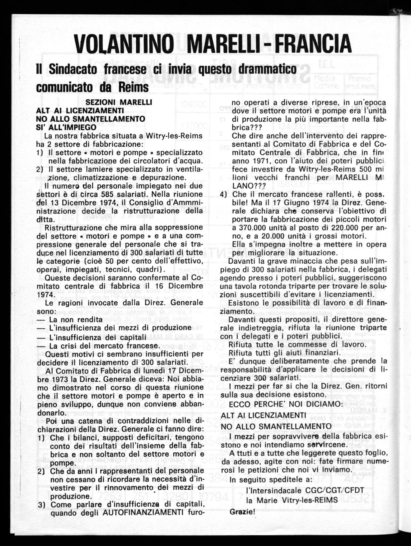 Episodi come quello che ha coinvolto la fabbrica Marelli di Reims in Francia e ahl quale diamo notizia in questo bollettino non pos sono lasciarci indirrenti, ne illuderci che il padrone non tenti anche in Italia di ripetere la tecnica dei licenziamenti di Massa