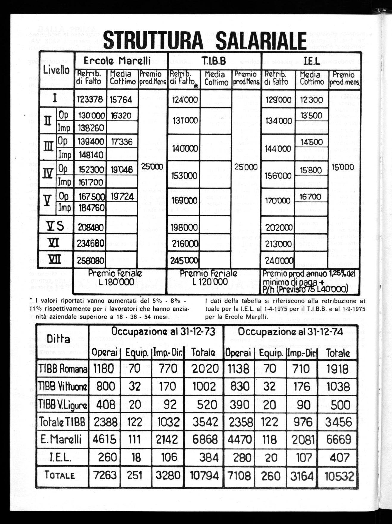 I dati della tabella si riferiscono alla retribuzione at tuale per la I.E.L. al 1-4-1975 per il T.I.B.B. e al 1-9-1975 per la Ercole Marelli.