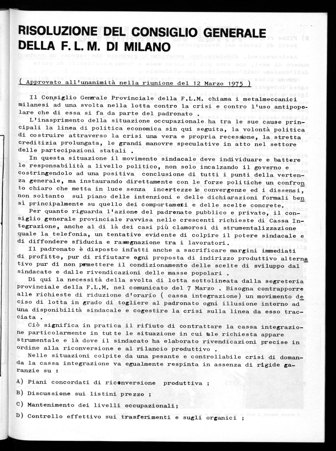 RISOLUZIONE DEL CONSIGLIO GENERALE DELLA F. L. M. DI MILANO