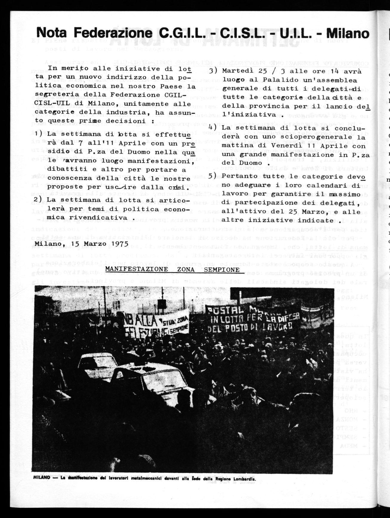 Più in genere ò necessario imporre il rilancio produttivo secondo le indicazioni del sindacato in quei settori che già oggi sono individuabili come potenzialmente trainanti e sostitutivi delle aree in crisi :produzione di energia, telefonia, elettronica, edilizia, tna.porti collettivi. La settimana di lotta proclamata dalla Federazione Milanese CGIL-CISL-UIL a partire dall'8 aprile va quindi preparata ed intesa come momento di collegamento della lotta per l'occupazione con l'iniziativa intercategoriale per gli investimenti .