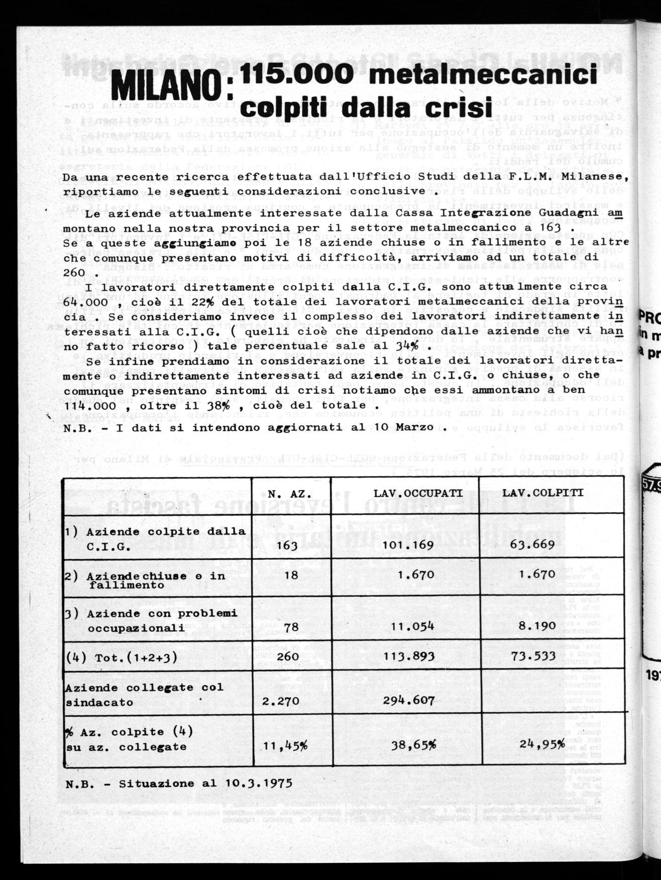 La gravità della situazione economica anche a Milano, denunciato dalla Federazione CGIL-CISL-UIL nel corso del economico, tende a pesare in modo sempre più forte sulla voratori e sulla occupazione . Si estende il ricorso ne e già avvengono nelle piccole aziende casi di Di fronte a tale situazione, che non presenta si di ulteriore deterioramento, numerose lotte sono investimenti, riconversione produttiva nella provincia per occupazione, e