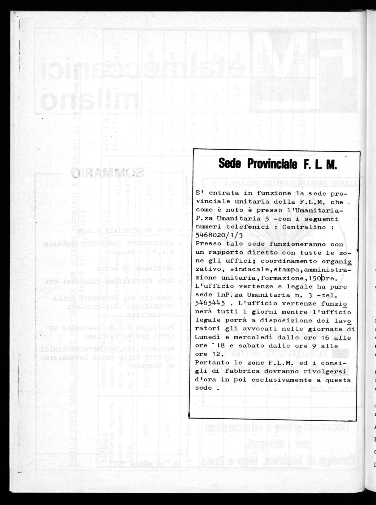 Presso tale sede funzioneranno con un rapporto diretto con tutte le zone gli uffici; coordinamento organiz zativo, sindacale,stampa,amministrazione unitaria,formazione,15010re. L'ufficio vertenze e legale ha pure sede inP.za Umanitaria n. 3 -tel. 5465445 . L'ufficio vertenze funzio nerà tutti i giorni mentre l'ufficio legale porrà a disposizione dei lavo ratori gli avvocati nelle giornate di Lunedì e mercoledì dalle ore 16 alle ore - 18 e sabato dalle ore 9 alle ore 12.