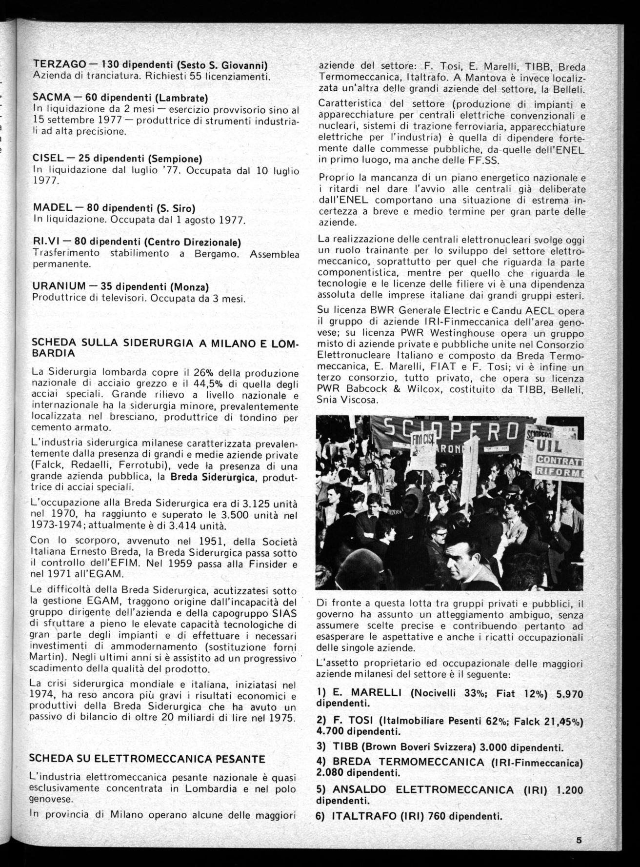 La campagna padronale che vuole spiegare le difficoltà presenti nel Gruppo Alfa Romeo, in particolare all'Alfa Sud, come conseguenza di responsabilità del Sindacato e dei lavoratori per coprire le responsabilità insite nelle scelte gestionali compiute in questi anni e per affrontare i problemi dell'Alfa in termini di attacco all'occupazione, al potere e alle condizioni dei lavoratori in fabbrica, senza prospettare scelte nuove legate ai problemi di un diverso sviluppo del Paese; si aggiunge alle situazioni sopra esposte della Breda Siderurgica e della Sit Siemens e a quanto sta accadendo in altri settori, da quello alimentare (Unidal) al chimico (Eni). Tutto ciò pone con forza la necessità di un confronto complessivo di tutto il movimento sindacale a livello milanese, regionale e nazionale, sui problemi del riassetto istituzionale e della riorganizzazione delle PP.SS., dell'assegnazione da parte del Governo alle aziende a PP.SS. degli indispensabili adeguamenti dei mezzi finanziari (ricapitolizzazione), della definizione dei piani settoriali (siderurgia, elettronica, agro-industria, energia, trasporti) nel cui ambito operino aziende pubbliche, della contrattazione dei programmi di investimento dell'IRI.