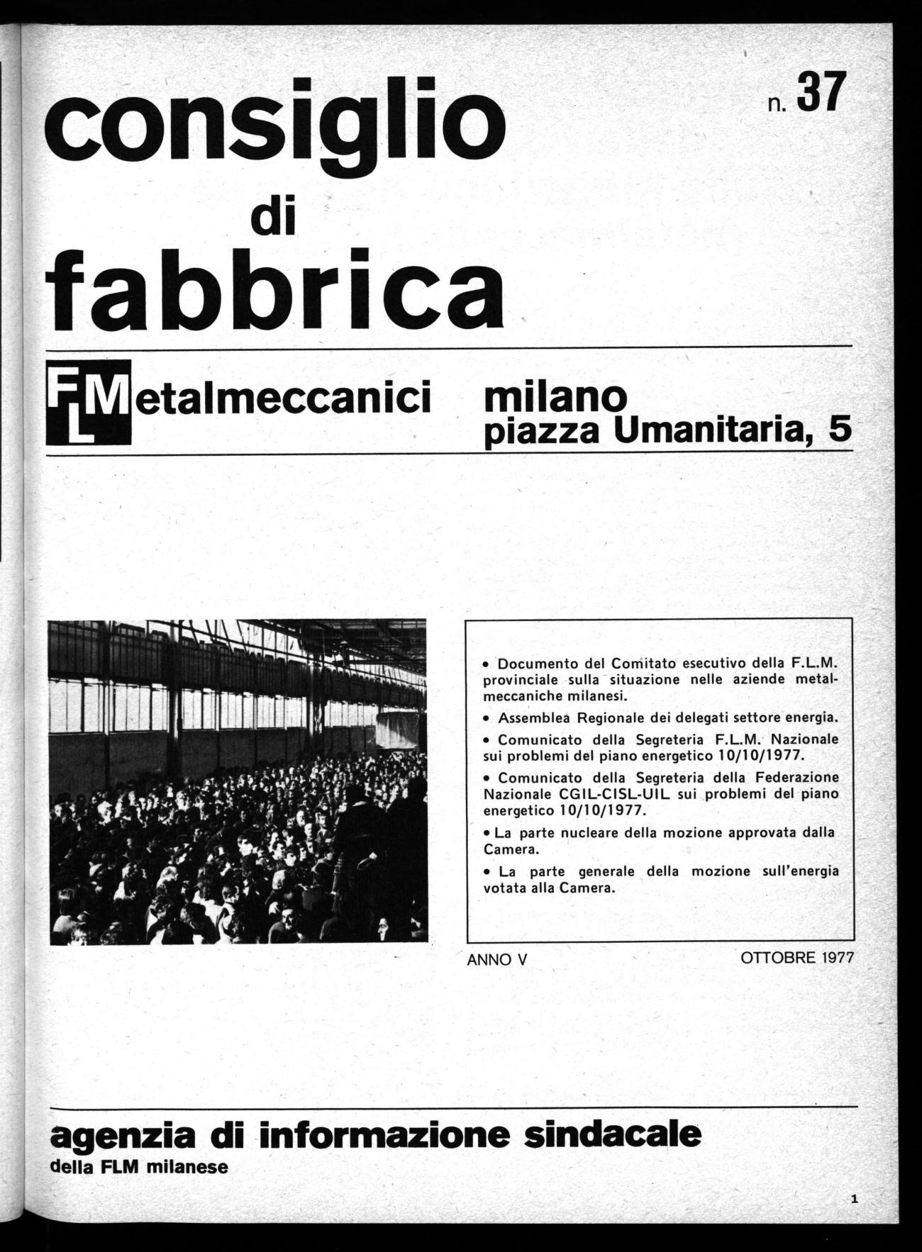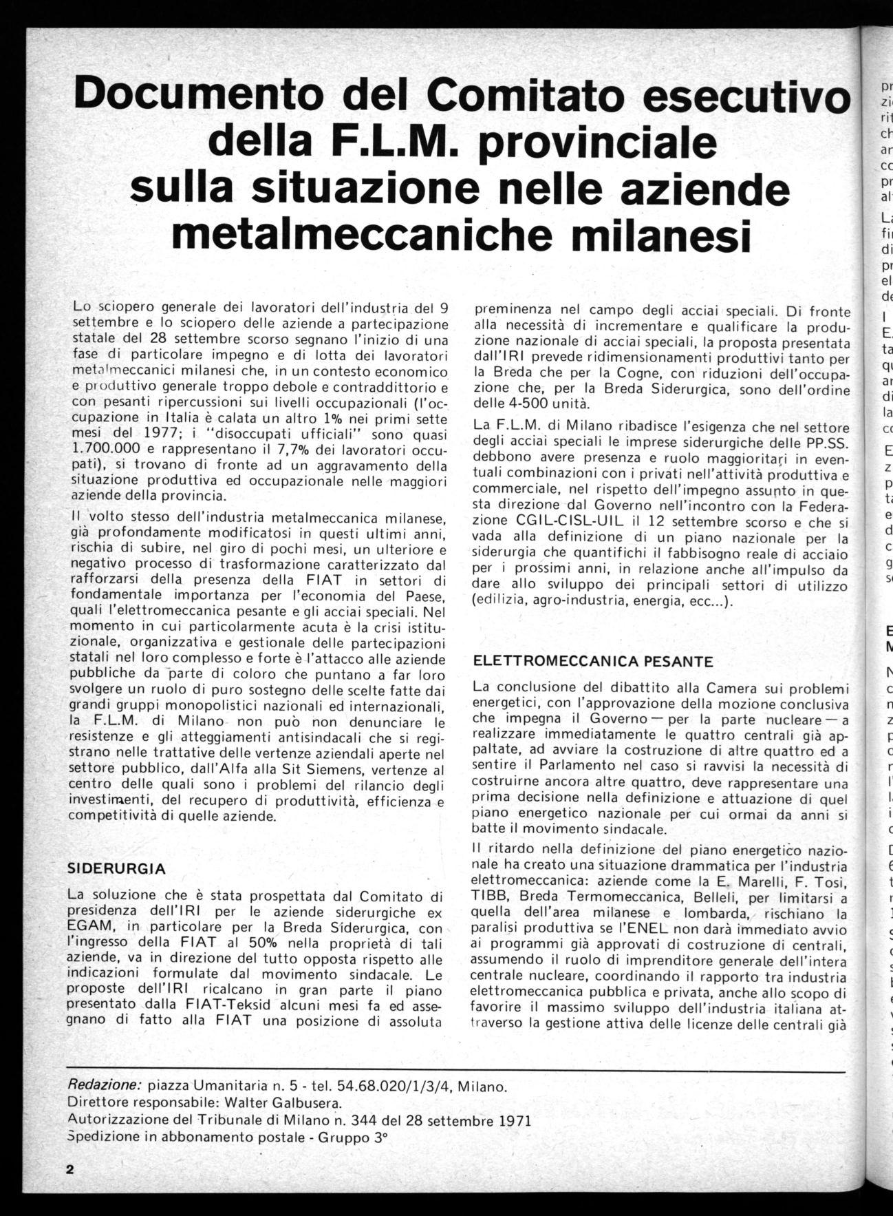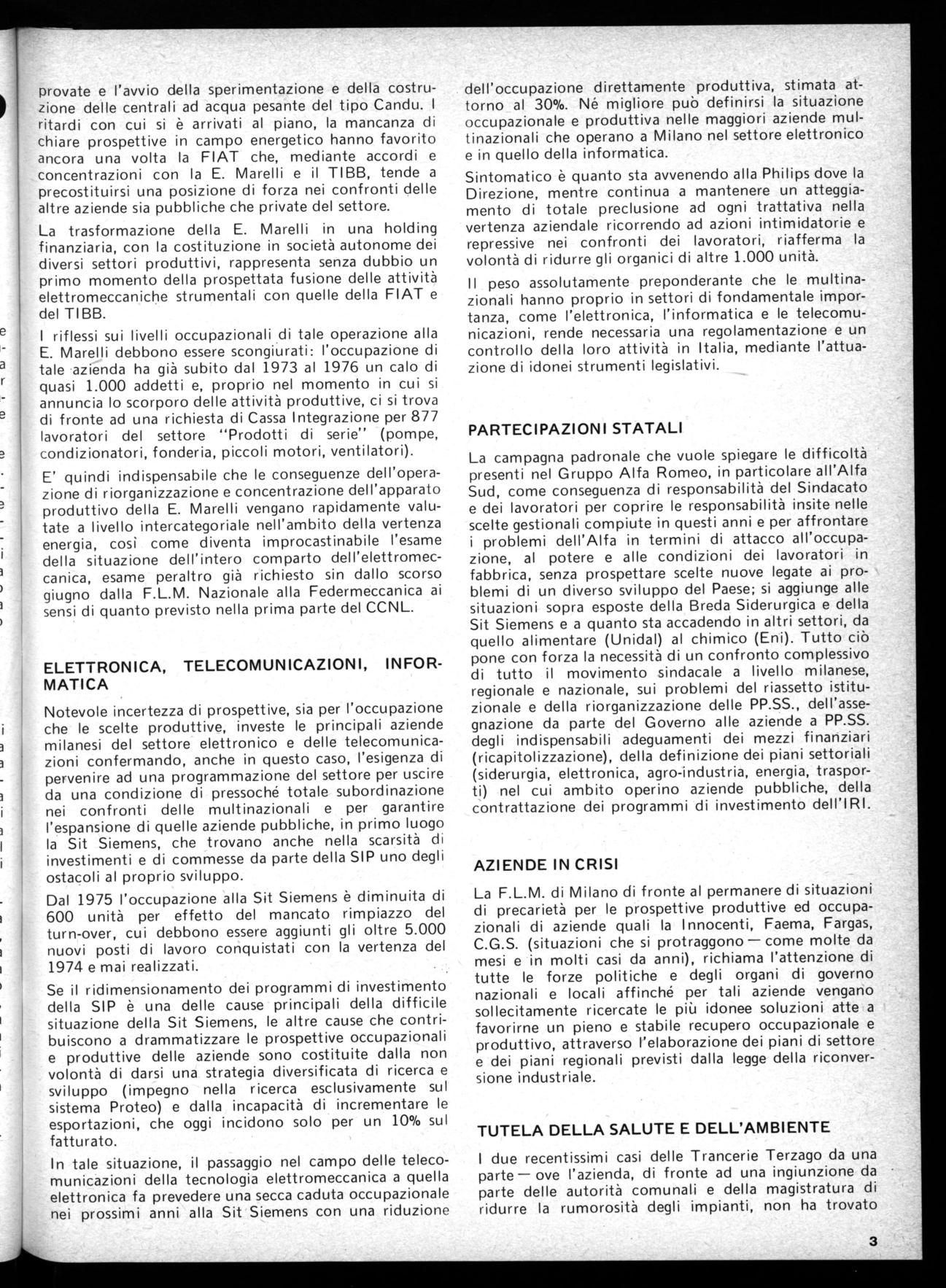 Il volto stesso dell'industria metalmeccanica milanese, già profondamente modificatosi in questi ultimi anni, rischia di subire, nel giro di pochi mesi, un ulteriore e negativo processo di trasformazione caratterizzato dal rafforzarsi della presenza della FIAT in settori di fondamentale importanza per l'economia del Paese, quali l'elettromeccanica pesante e gli acciai speciali. Nel momento in cui particolarmente acuta è la crisi istituzionale, organizzativa e gestionale delle partecipazioni statali nel loro complesso e forte è l'attacco alle aziende pubbliche da parte di coloro che puntano a far loro svolgere un ruolo di puro sostegno delle scelte fatte dai grandi gruppi monopolistici nazionali ed internazionali, la F.L.M. di Milano non può non denunciare le resistenze e gli atteggiamenti antisindacali che si registrano nelle trattative delle vertenze aziendali aperte nel settore pubblico, dall'Alfa alla Sit Siemens, vertenze al centro delle quali sono i problemi del rilancio degli investimenti, del recupero di produttività, efficienza e competitività di quelle aziende.