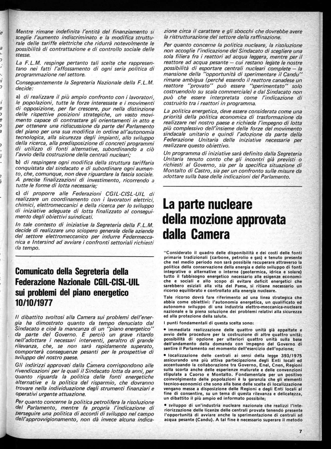 Parlamento ma anche ad influenzare nel merito delle decisioni che saranno assunte dallo stesso; apertura nei confronti dell'ENEL di una vertenza Nazionale che ponga al centro i problemi di ristrutturazione e decentramento dell'Ente con il sostegno politico e operativo della Federazione CG L; mobilitazione del settore per costringere la Federmeccanica ad effettuare quegli incontri sui programmi di settore previsti dal CCNL e già richiesti dal 15 giugno scorso;