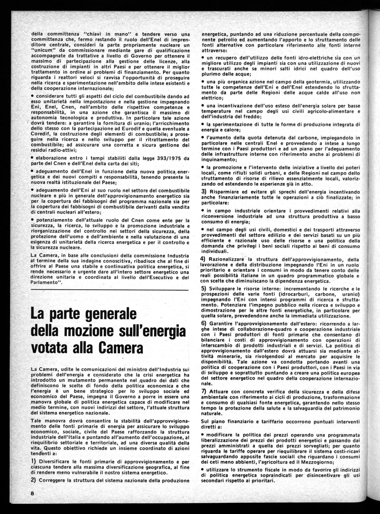 La conclusione del dibattito alla Camera sui problemi energetici, con l'approvazione della mozione conclusiva che impegna il Governo — per la parte nucleare — a realizzare immediatamente le quattro centrali già appaltate, ad avviare la costruzione di altre quattro ed a sentire il Parlamento nel caso si ravvisi la necessità di costruirne ancora altre quattro, deve rappresentare una prima decisione nella definizione e attuazione di quel piano energetico nazionale per cui ormai da anni si batte il movimento sindacale.