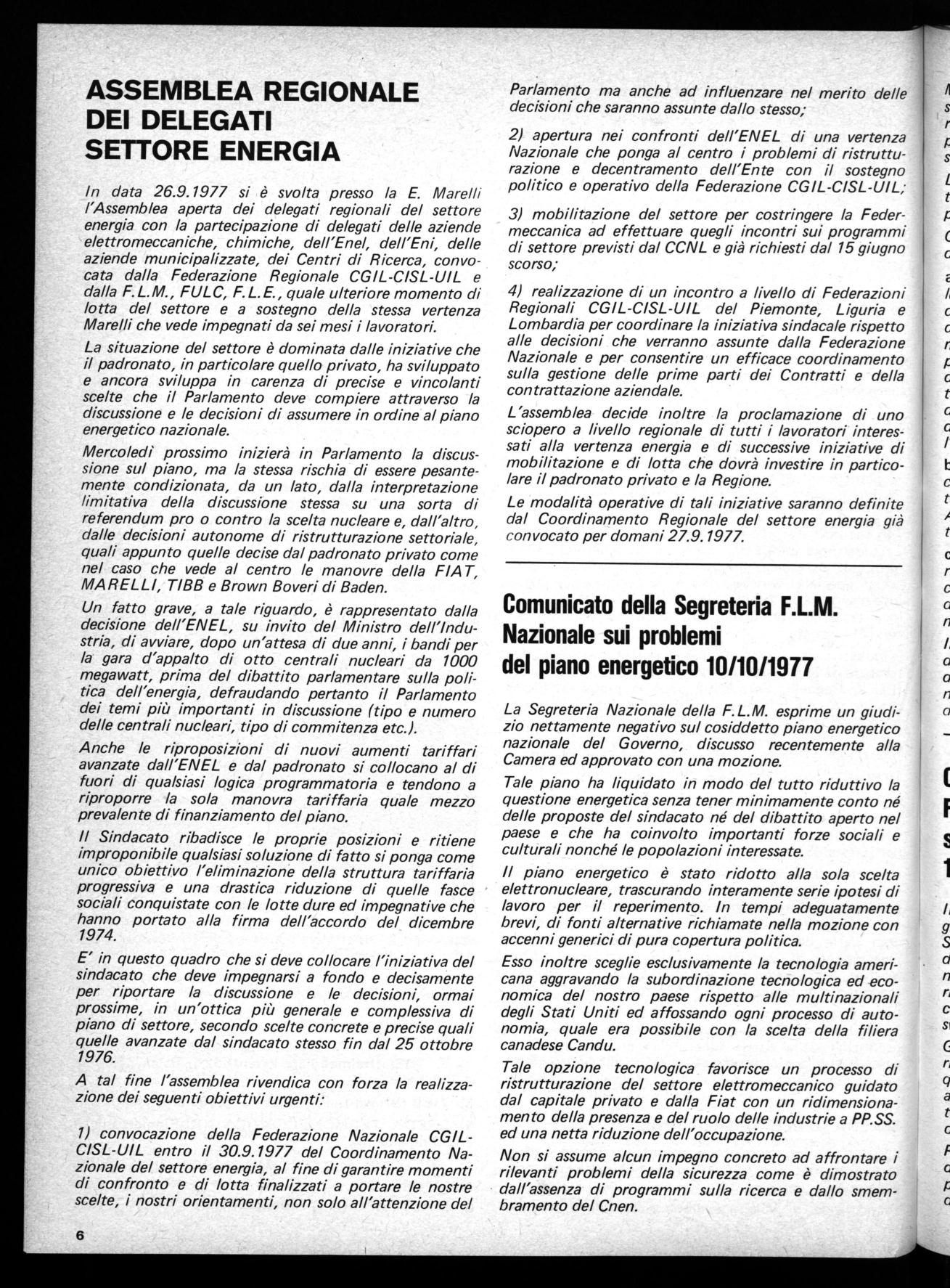 In data 26.9.1977 si è svolta presso la E. Marelli l'Assemblea aperta dei delegati regionali del settore energia con la partecipazione di delegati delle aziende elettromeccaniche, chimiche, dell'Enel, dell'Eni, delle aziende municipalizzate, dei Centri di Ricerca, convocata dalla Federazione Regionale CGIL-CISL-UIL e dalla F.L.M., FULC, F. L. E., quale ulteriore momento di lotta del settore e a sostegno della stessa vertenza Marelli che vede impegnati da sei mesi i lavoratori.