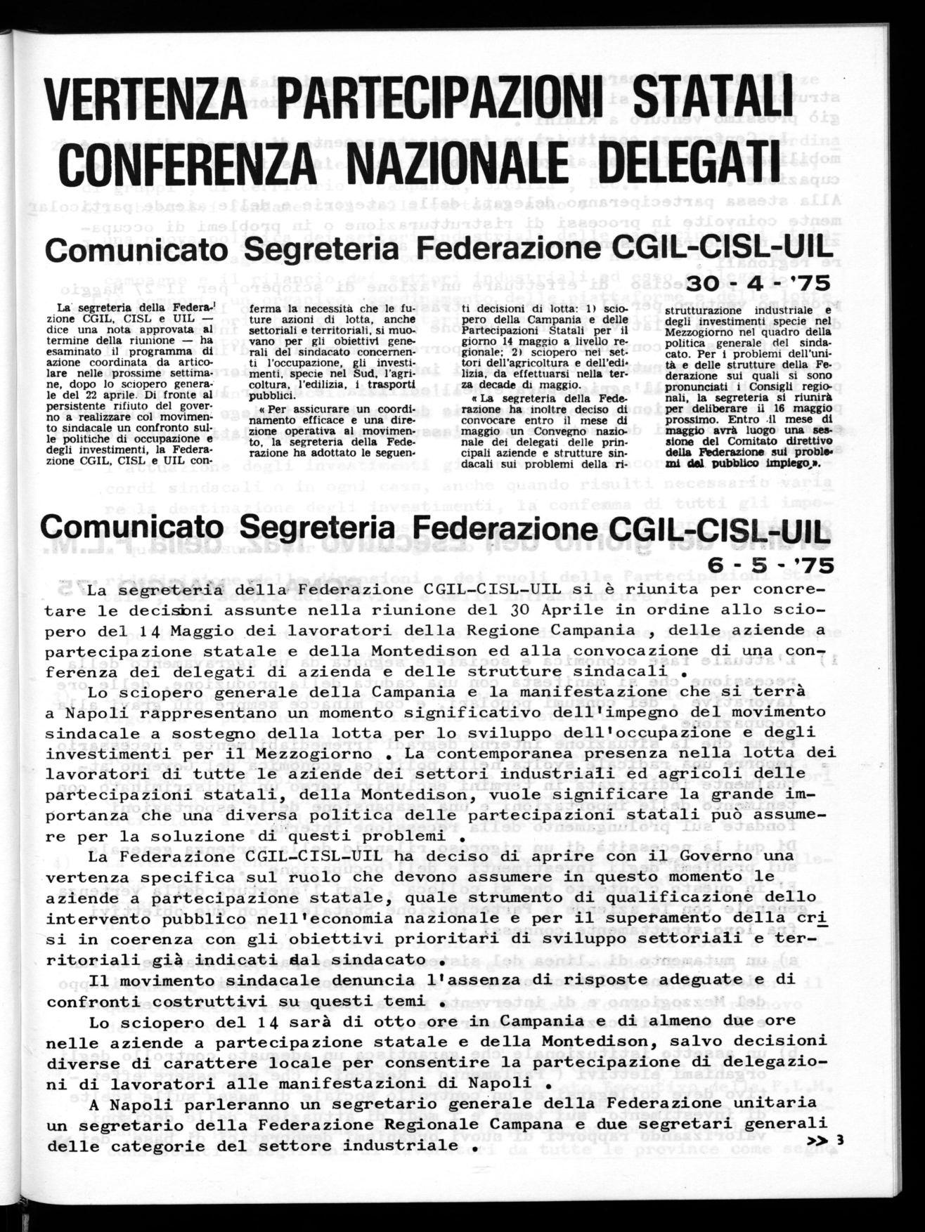 Vertenza Partecipazioni Statali: Comunicato Segreteria Federazio ne CGIL-CISL-UIL del 30 aprile 1975;