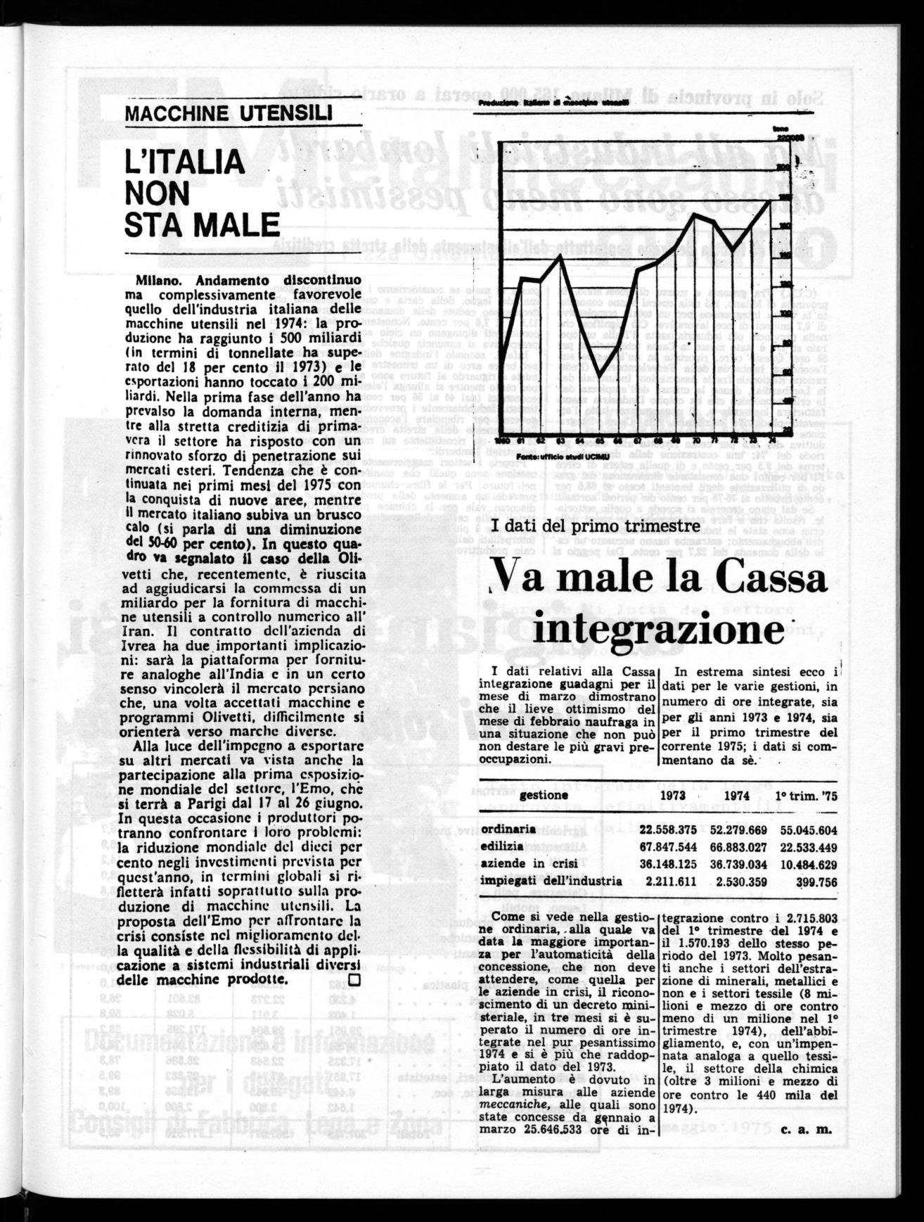 tegrazione contro i 2.715.803 del 1° trimestre del 1974 e il 1.570.193 dello stesso periodo del 1973. Molto pesanti anche i settori dell'estrazione di minerali, metallici e non e i settori tessile (8 milioni e mezzo di ore contro meno di un milione nel 1° trimestre 1974), dell'abbigliamento, e, con un'impennata analoga a quello tessile, il settore della chimica (oltre 3 milioni e mezzo di ore contro le 440 mila del 1974).