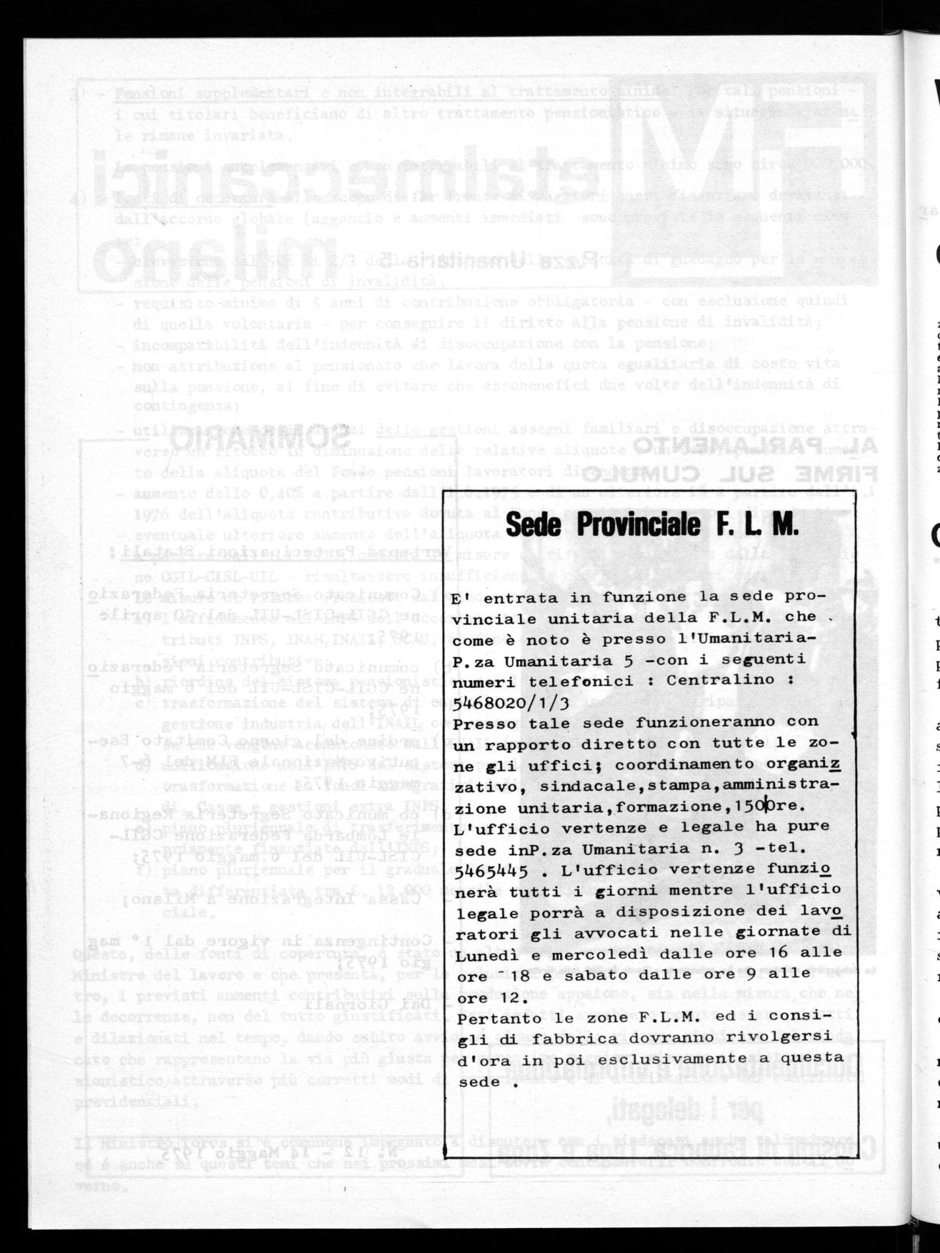 E' entrata in funzione la sede provinciale unitaria della F.L.M. che come è noto è presso l'UmanitariaP.za Umanitaria 5 -con i seguenti numeri telefonici : Centralino : 5468020/1/3