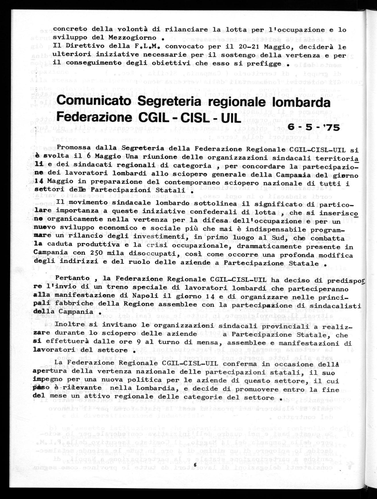 co municato Segreteria Regionale Lombarda Federazione CGILCISL-UIL del 6.maggio 1975;