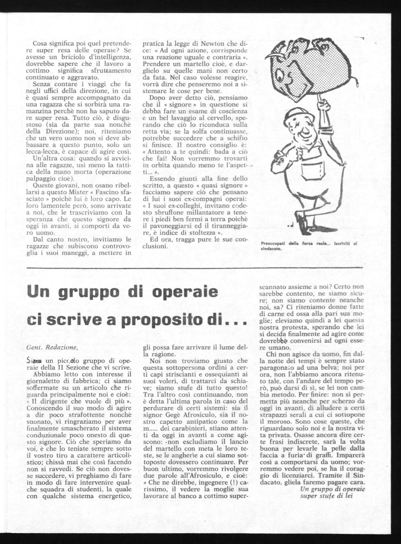 Abbiamo letto con interesse il giornaletto di fabbrica; ci siamo soffermate su un articolo che riguarda principalmente noi e cioè: « Il dirigente che vuole di più ». Conoscendo il suo modo di agire a dìr poco strafottente nonchè suonato, vi ringraziamo per aver finalmente smascherato il sistema conduzionale poco onesto di questo signore. Ciò che speriamo da voi, è che lo teniate sempre sotto il vostro tiro a carattere articolistico; chissà mai che così facendo non si ravvedi. Se ciò non dovesse succedere, vi preghiamo di fare in modo di fare intervenire qualche squadra di studenti, la quale con qualche sistema energetico,