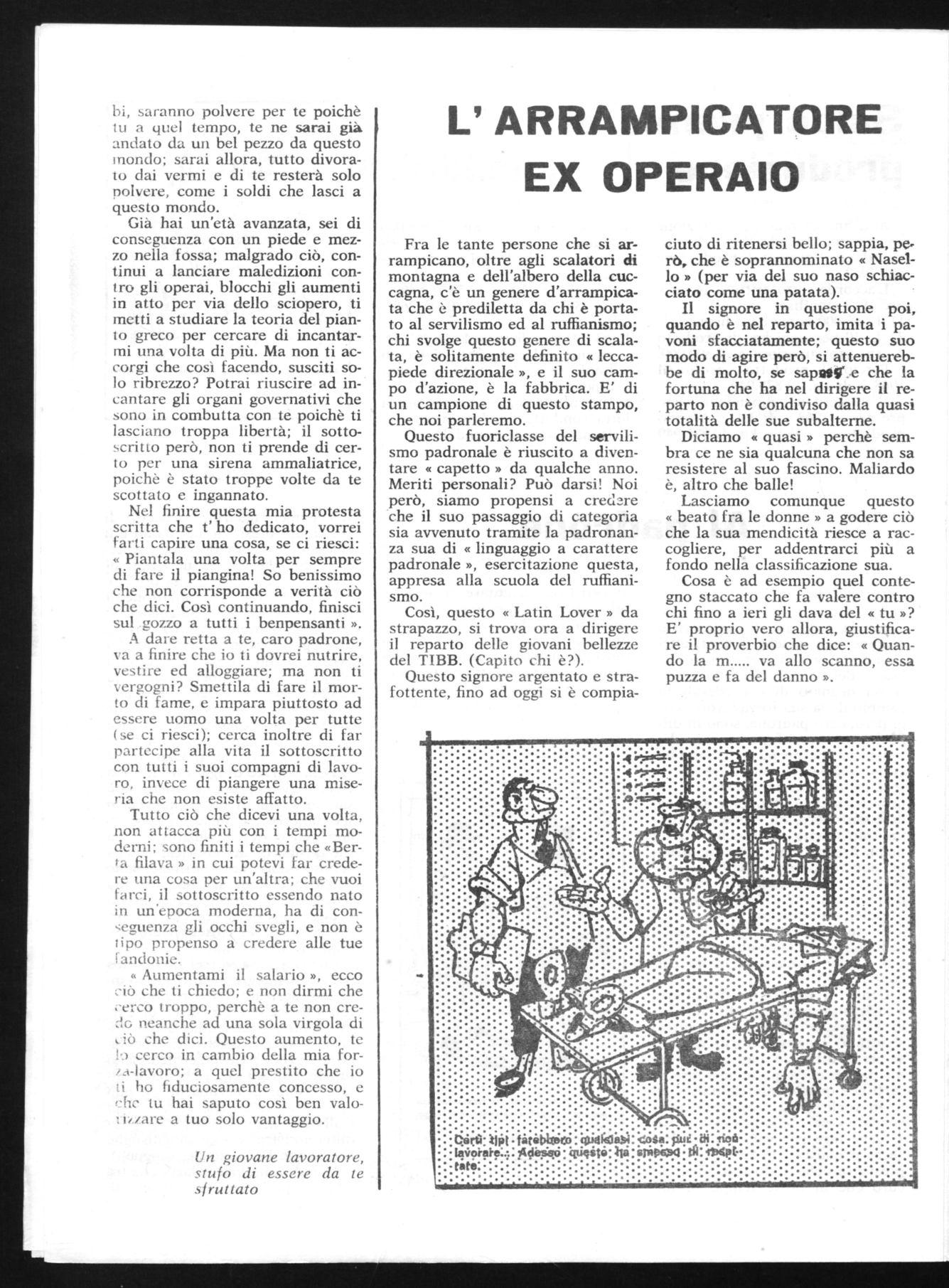 Fra le tante persone che si arrampicano, oltre agli scalatori di montagna e dell'albero della cuccagna, c'è un genere d'arrampicata che è prediletta da chi è portato al servilismo ed al ruffianismo; chi svolge questo genere di scalata, è solitamente definito « leccapiede direzionale », e il suo campo d'azione, è la fabbrica. E' di un campione di questo stampo, che noi parleremo.