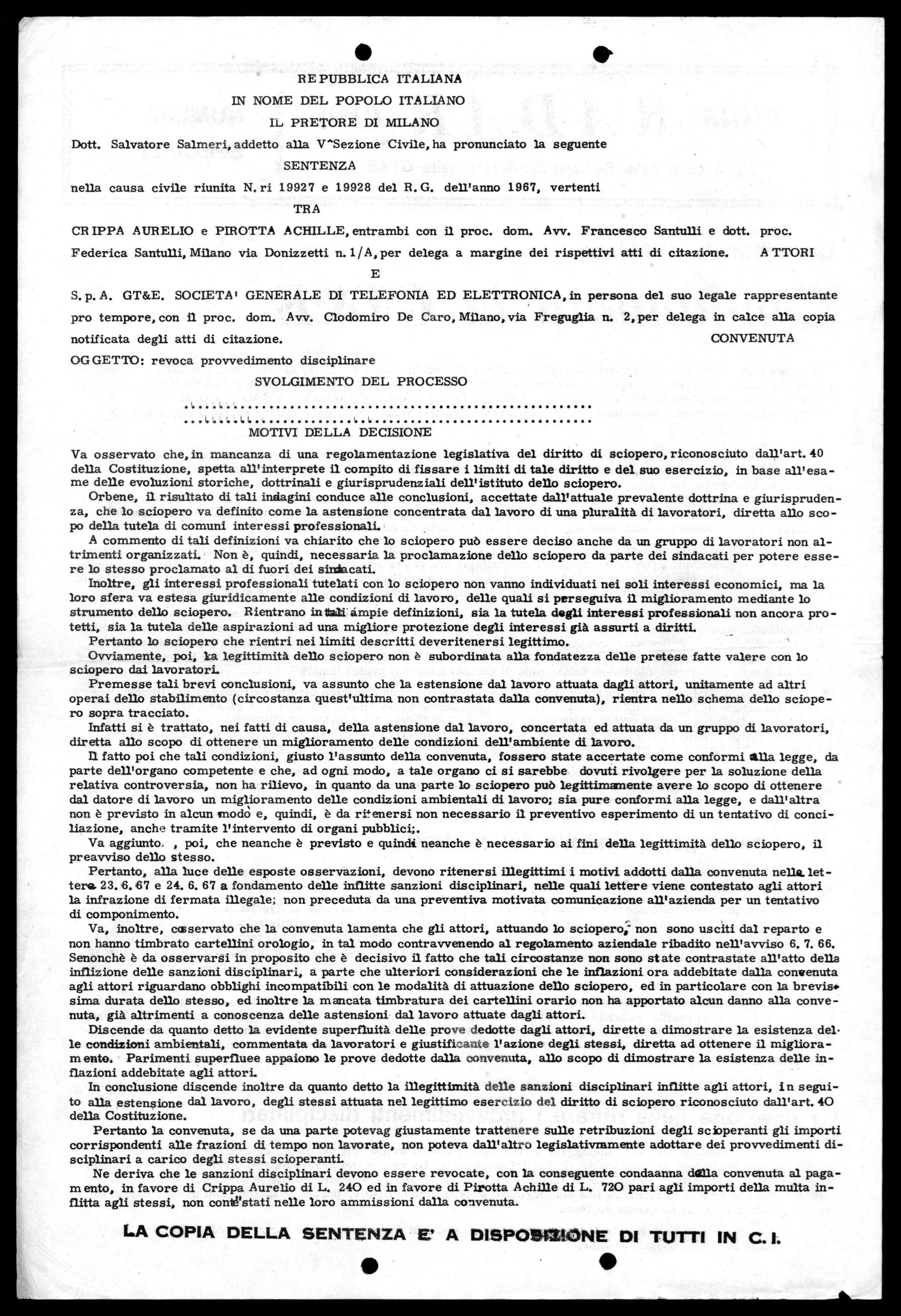A due anni di distanza dalla vertenza aperta da due nostri compagni nei confronti della direzione, il Pretore di Milano, addetto alla Sezione Civile, ha pronunciato la sua sentenza di condanna della S. p. A. GT&E, in persona del suo legale avv. Clodomiro De Caro.
