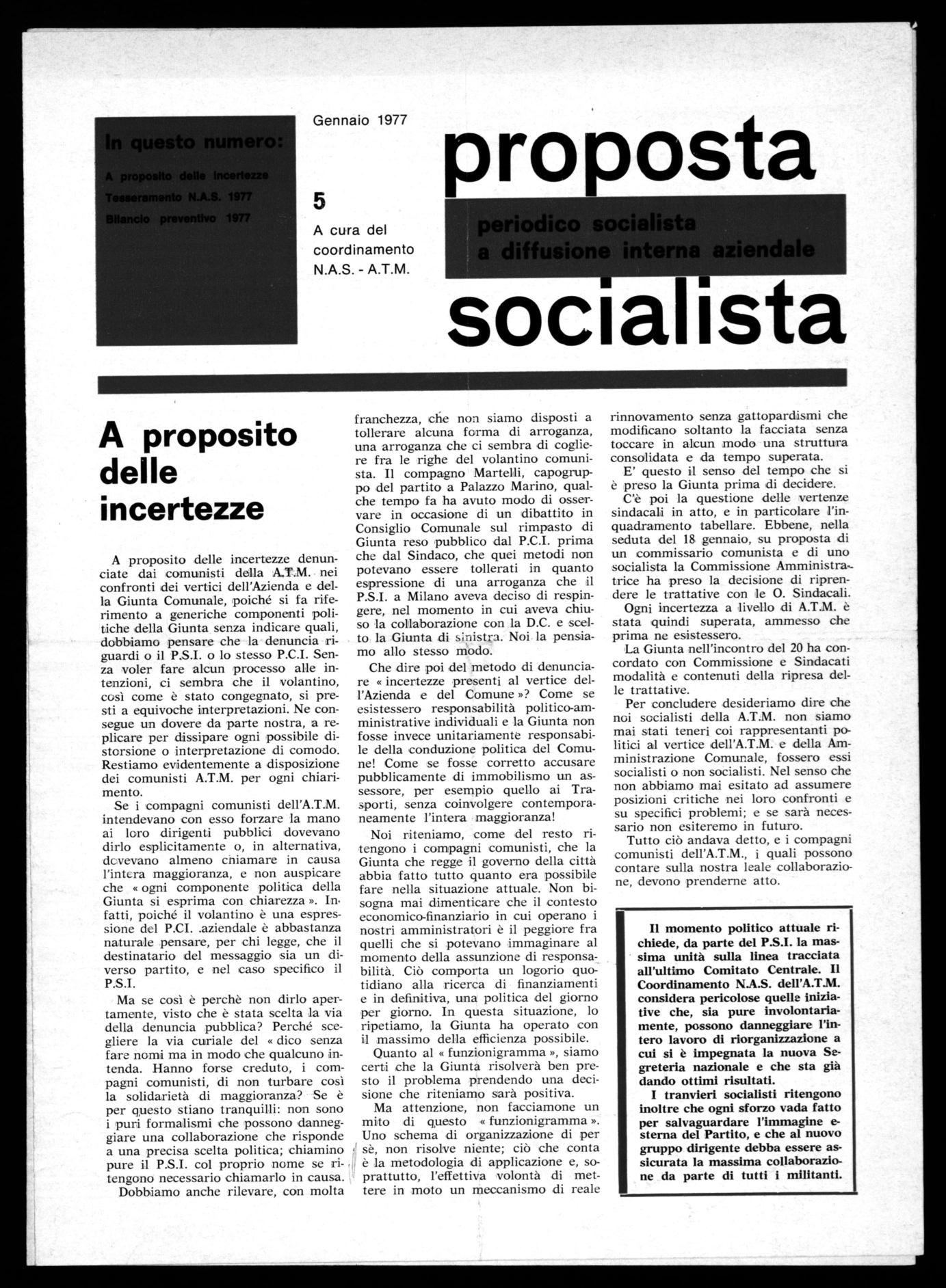 Il momento politico attuale richiede, da parte del P.S.I. la massima unità sulla linea tracciata all'ultimo Comitato Centrale. Il Coordinamento N.A.S. dell'A.T.M. considera pericolose quelle iniziative che, sia pure involontariamente, possono danneggiare l'intero lavoro di riorganizzazione a cui si è impegnata la nuova Segreteria nazionale e che sta già dando ottimi risultati.