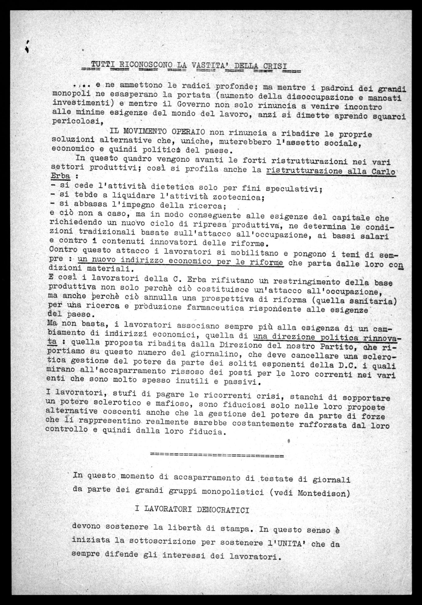 E così i lavoratori della C. Erba rifiutano uh restringimento della base produttiva non solo perchè ciò costituisce un'attacco all'occupazione, ma anche terchè ciò annulla una prospettiva di riforma (quella sanitaria) per una ricerca e prbduzione farmaceutica rispondente alle esigenze del paese.