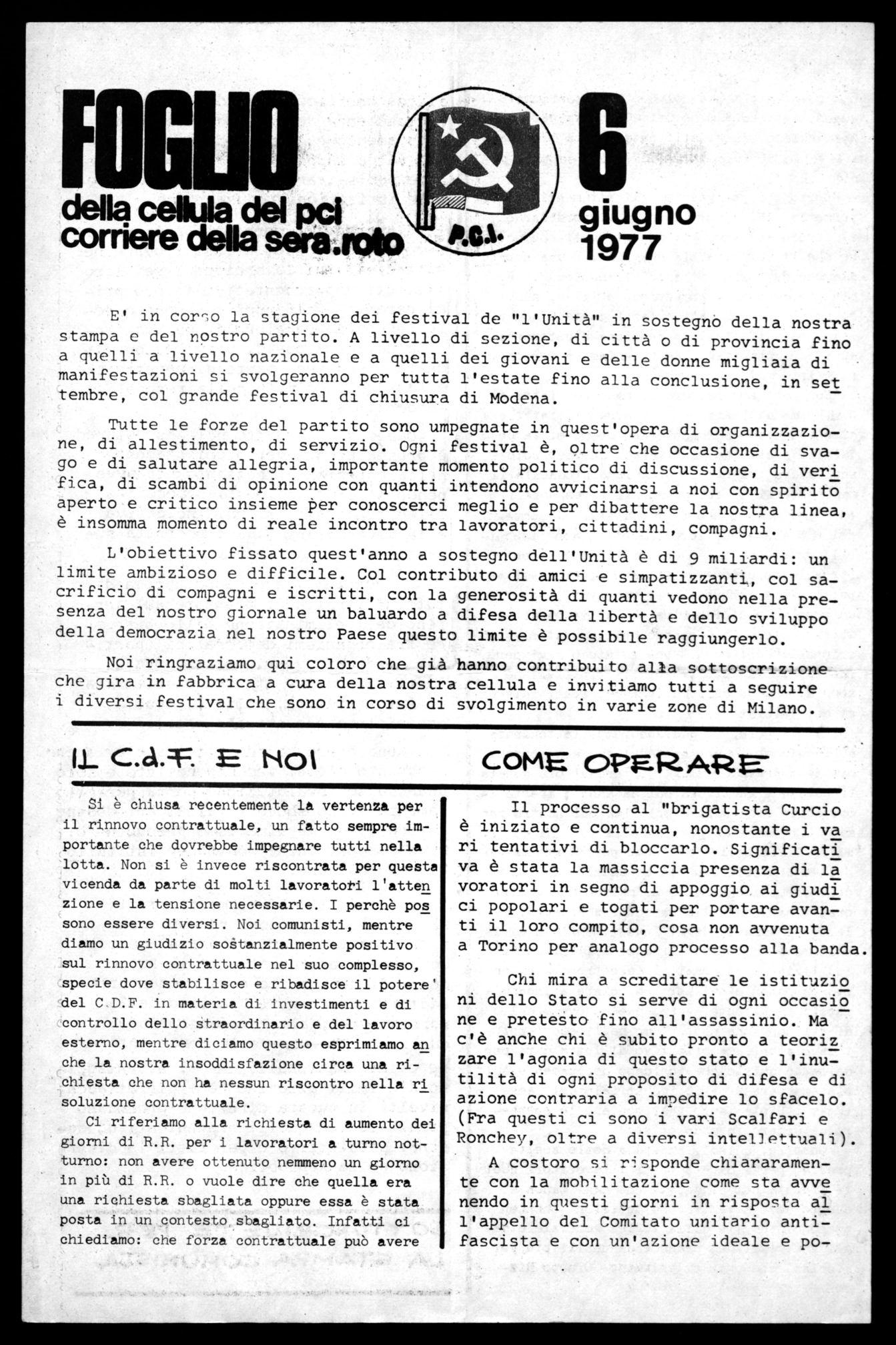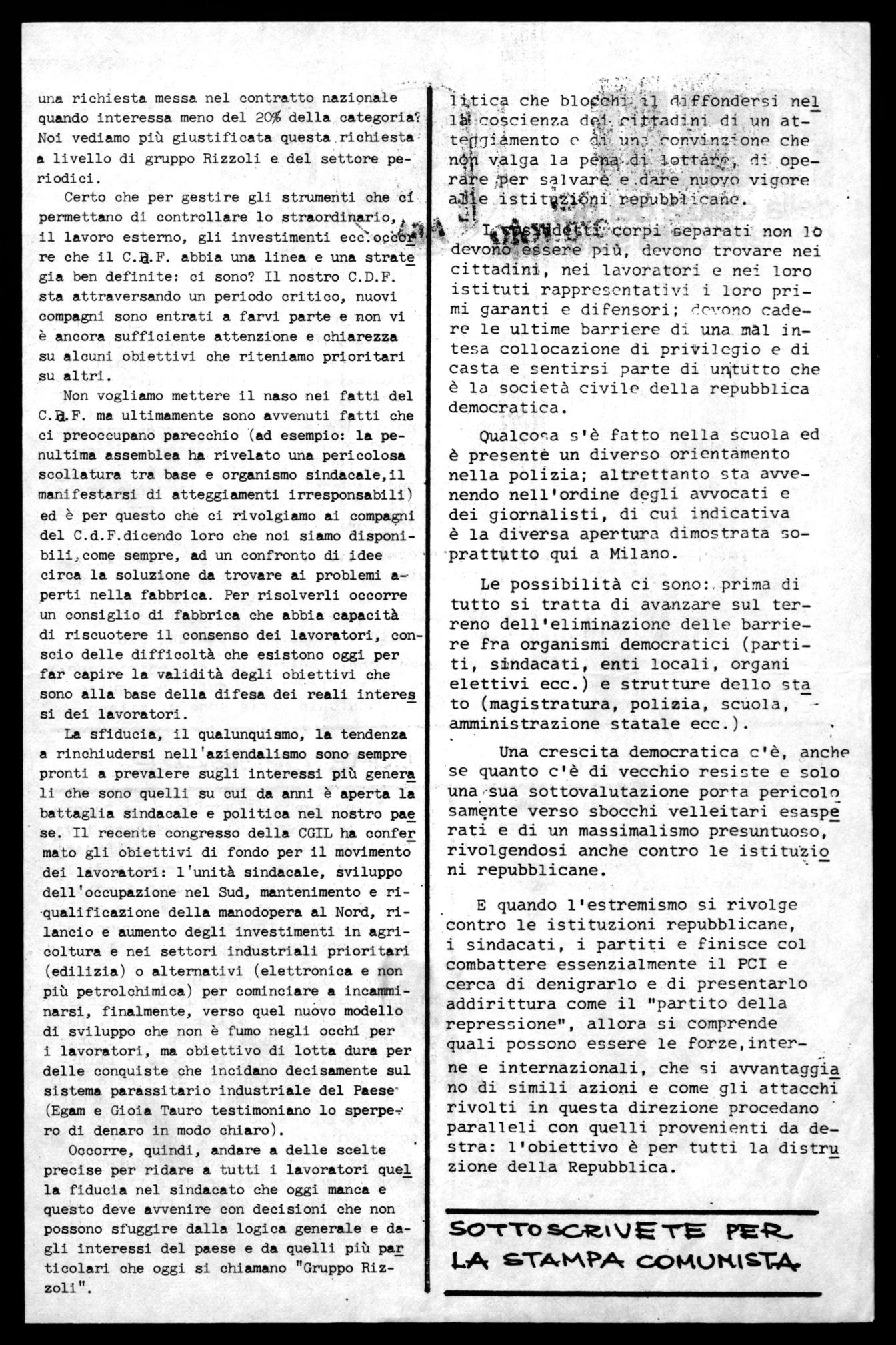 Non vogliamo mettere il naso nei fatti del C.a.F. ma ultimamente sono avvenuti fatti che ci preoccupano parecchio (ad esempio: la penultima assemblea ha rivelato una pericolosa scollatura tra base e organismo sindacale,il manifestarsi di atteggiamenti irresponsabili) ed è per questo che ci rivolgiamo ai compagni del C.d.F.dicendo loro che noi siamo disponibili,come sempre, ad un confronto di idee circa la soluzione da trovare ai problemi aperti nella fabbrica. Per risolverli occorre un consiglio di fabbrica che abbia capacità di riscuotere il consenso dei lavoratori, conscio delle difficoltà che esistono oggi per far capire la validità degli obiettivi che sono alla base della difesa dei reali interes si dei lavoratori.