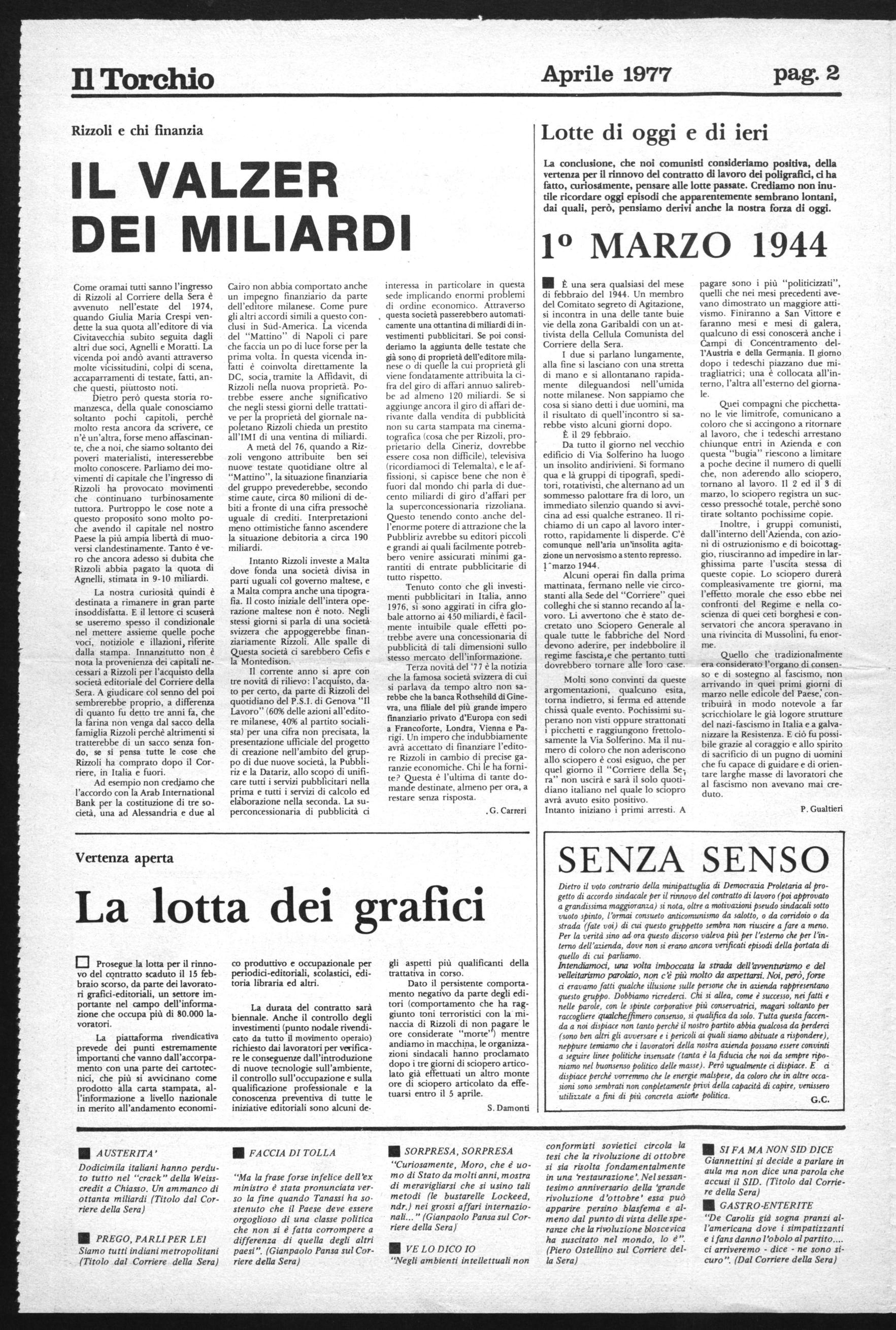 Dato il persistente comportamento negativo da parte degli editori (comportamento che ha raggiunto toni terroristici con la minaccia di Rizzoli di non pagare le ore considerate "morte' ) mentre andiamo in macchina, le organizzazioni sindacali hanno proclamato dopo i tre giorni di sciopero articolato già effettuati un altro monte ore di sciopero articolato da effetuarsi entro il 5 aprile.