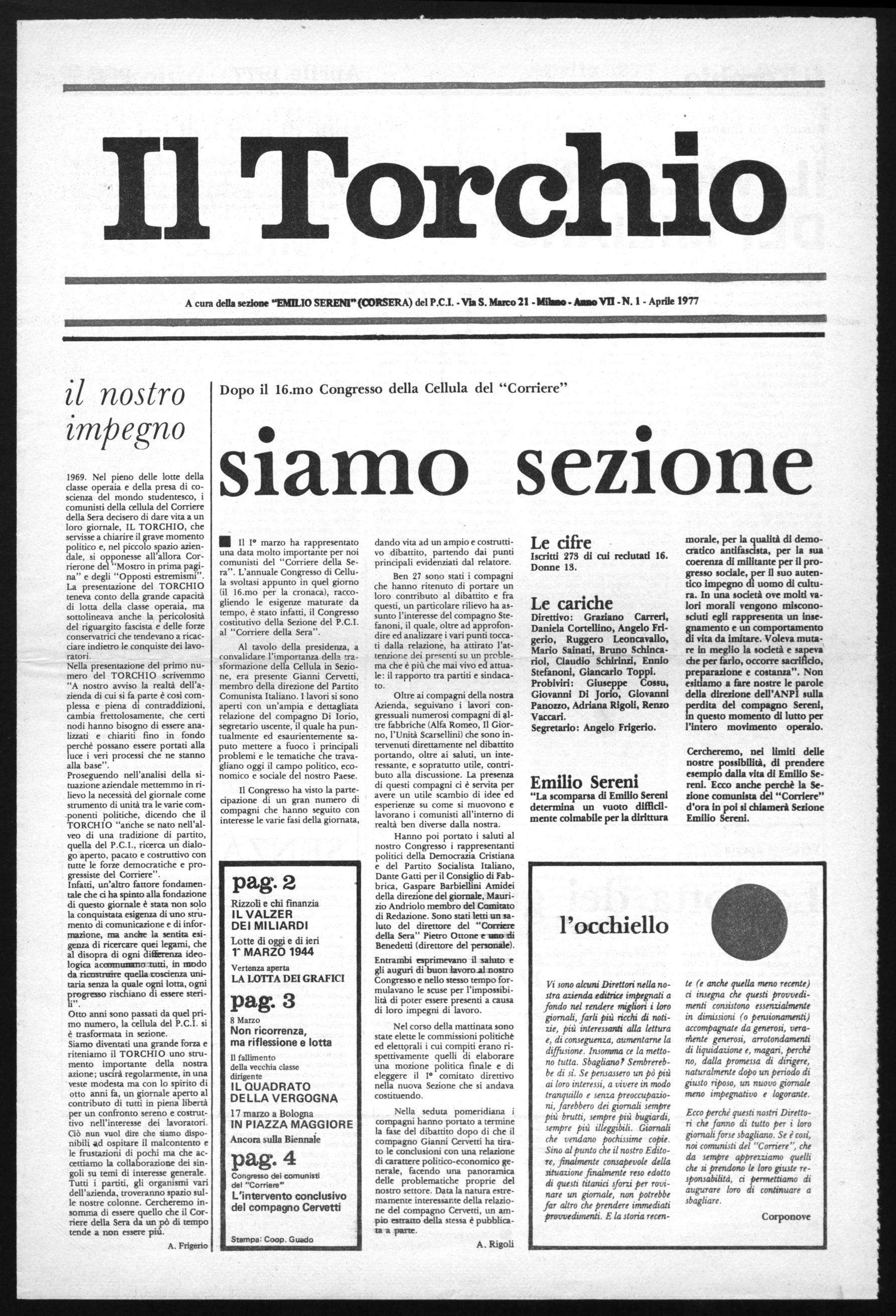 1969. Nel pieno delle lotte della classe operaia e della presa di coscienza del mondo studentesco, i comunisti della cellula del Corriere della Sera decisero di dare vita a un loro giornale, IL TORCHIO, che servisse a chiarire il grave momento politico e, nel piccolo spazio aziendale, si opponesse all'allora Corrierone del "Mostro in prima pagina" e degli "Opposti estremismi".