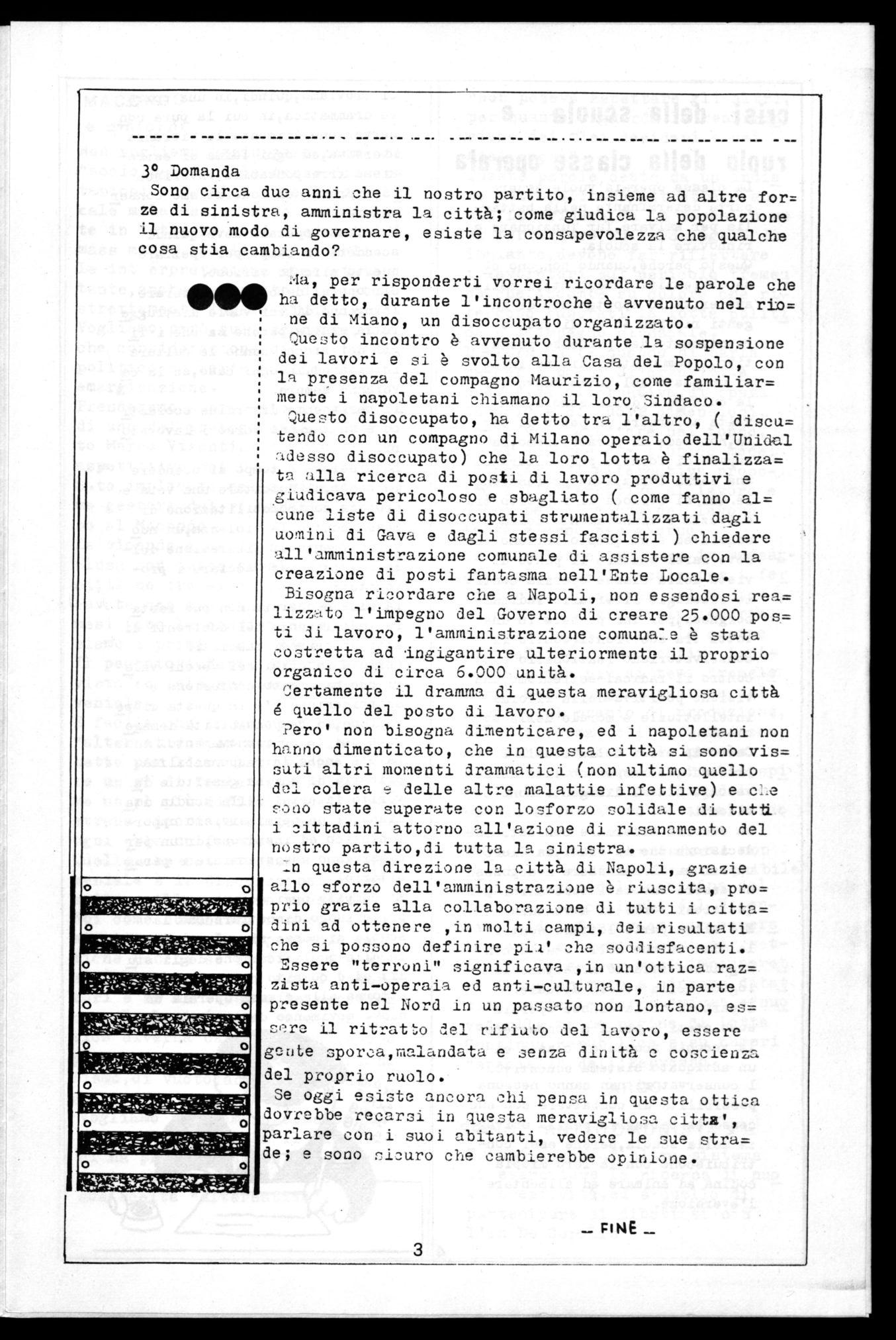 Questo disoccupato, ha detto tra l'altro, ( discu= tendo con un compagno di Milano operaio dell'Unidal adesso disoccupato) che la loro lotta è finalizza= ta alla ricerca di posti di lavoro produttivi e giudicava pericoloso e sbagliato ( come fanno al= cune liste di disoccupati strumentalizzati dagli uomini di Gava e dagli stessi fascisti ) chiedere all'amministrazione comunale di assistere con la creazione di posti fantasma nell'Ente Locale.