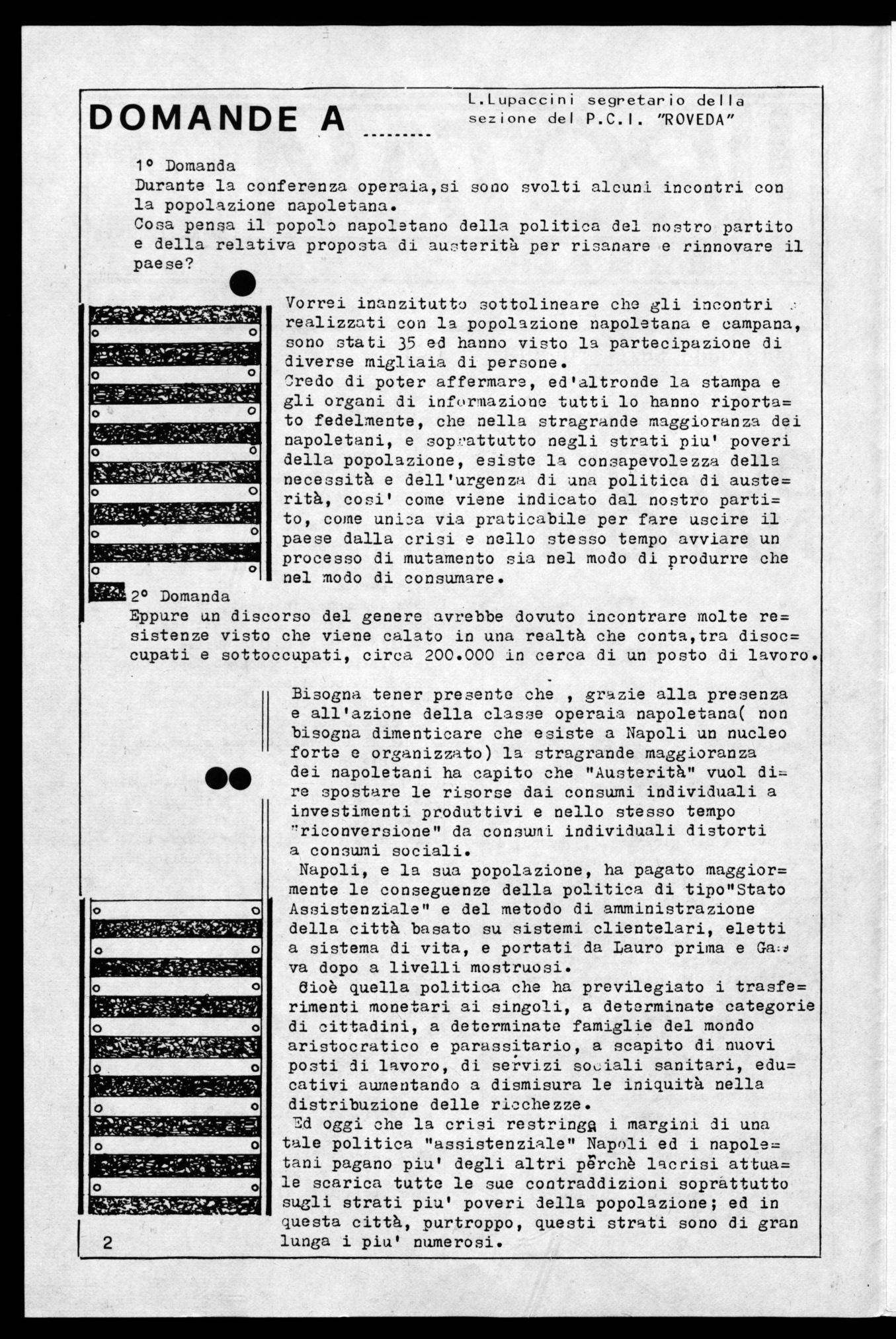 Credo di poter affermare, ed'altronde la stampa e gli organi di infornazione tutti lo hanno riporta= to fedelmente, che nella stragrande maggioranza dei napoletani, e soprattutto negli strati piu' poveri della popolazione, esiste la consapevolezza della necessità e dell'urgenza di una politica di auste= rità, cosi' come viene indicato dal nostro parti= to, come unica via praticabile per fare uscire il paese dalla crisi e nello stesso tempo avviare un processo di mutamento sia nel modo di produrre che nel modo di consumare.