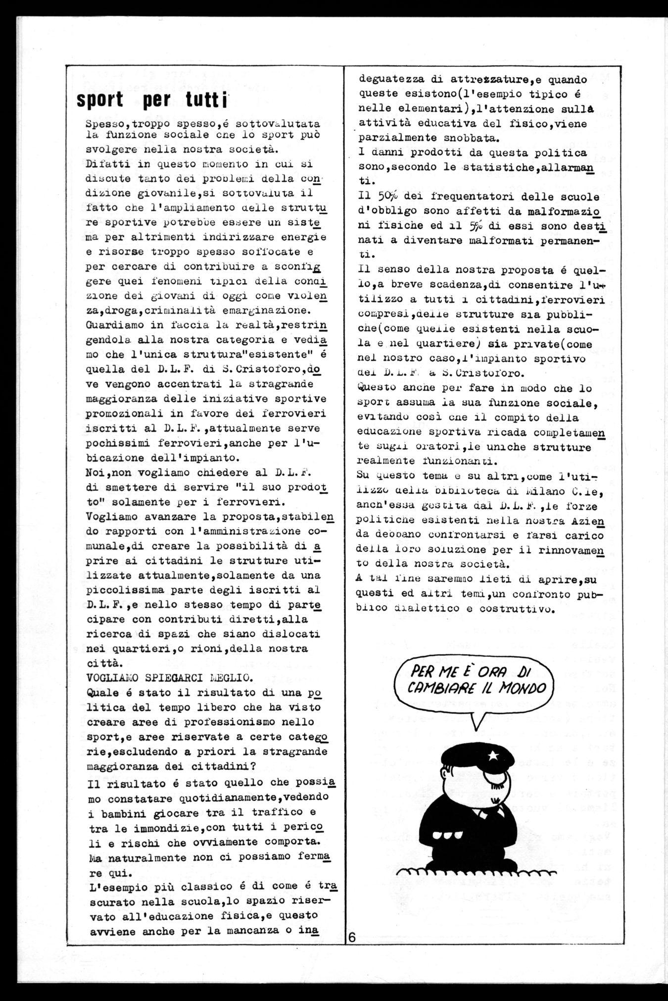 Spesso, troppo spessoyé sottoltrilutata la funzione sociale cne lo sport può svolgere nella nostra società. Difatti in questo momento in cui si discute tanto dei problemi della con dizione giovanile,si sottovaluta il fatto che l'ampliamento uelle struttu re sportive potrebbe essere un siste ma per altrimenti indirizzare energie e risorse troppo spesso soffocate e per cercare di contribuire a sconfiú Bere quei fenomeni tipici della conci zione dei Giovani di oggi come violen zaydroga,criminaiità emarginazione. Guardiamo in faccia la realtà,restrin gendola alla nostra categoria e vedia mo che l'unica struttura"esistente" é quella del D.L.F. di S.Cristoforo,do ve vengono accentrati la stragrande maggioranza delle iniziative sportive promozionali in favore dei ferrovieri iscritti al D.L.F.,attualmente serve pochissimi ferrovieriyanche per l'u— bicazione dell'impianto.
