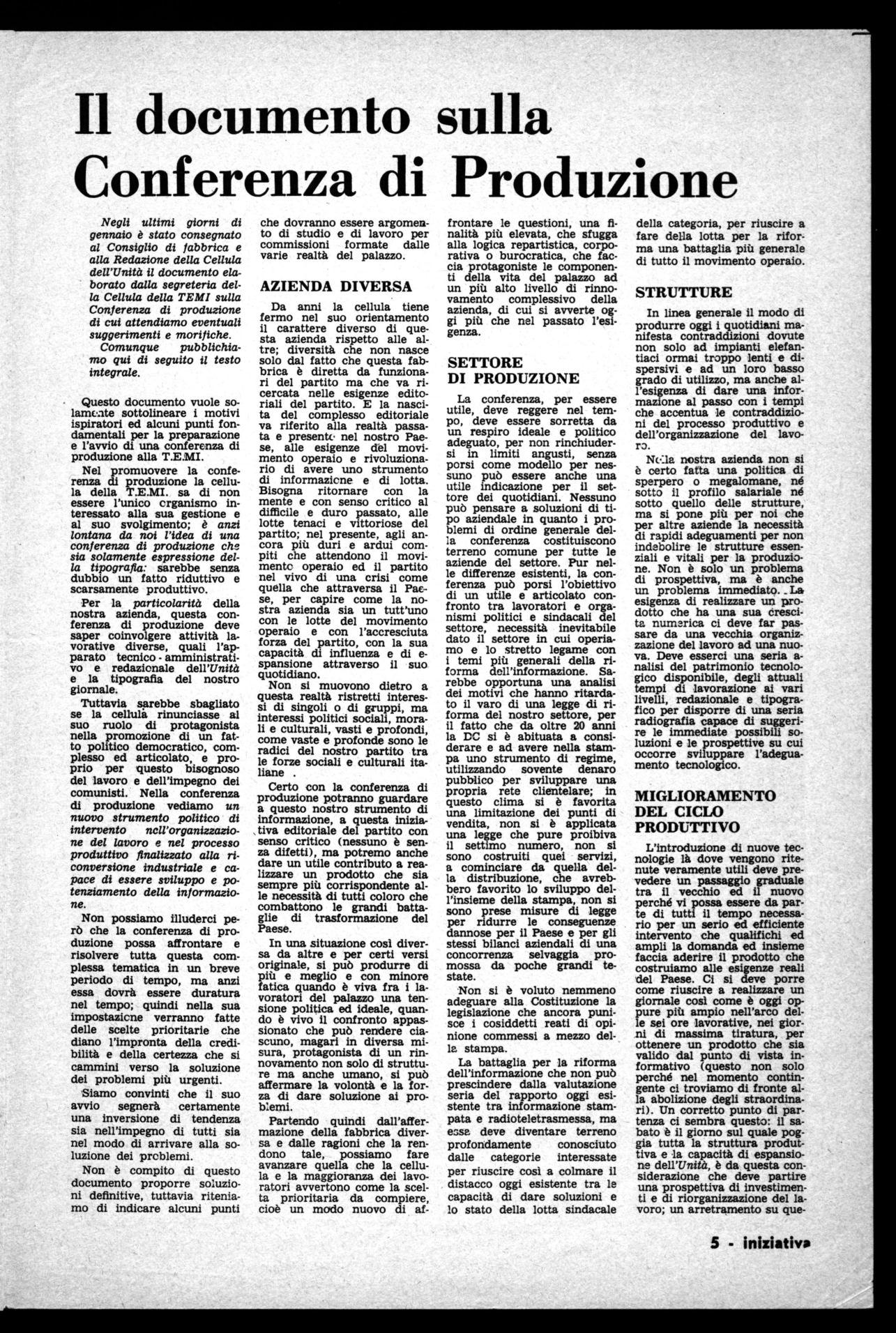 Negli ultimi giorni di gennaio è stato consegnato al Consiglio di fabbrica e alla Redazione della Cellula dell'Unità il documento elaborato dalla segreteria della Cellula della TEMI sulla Conferenza di produzione di cui attendiamo eventuali suggerimenti e morifiche. Comunque pubblichiamo qui di seguito il testo integrale.